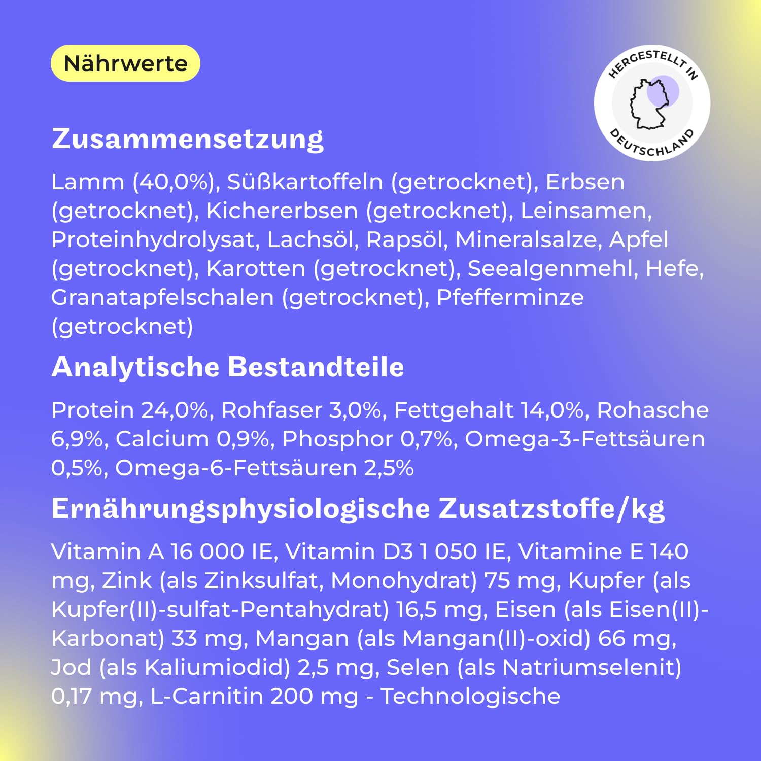 Es besteht ausschliesslich aus natürlichen Zutaten mit frischem Lamm als einziger tierischer Proteinquelle (Monoprotein). Die Rezeptur ist komplett getreidefrei und enthält keine künstlichen Zusätze oder tierische Nebenerzeugnisse.