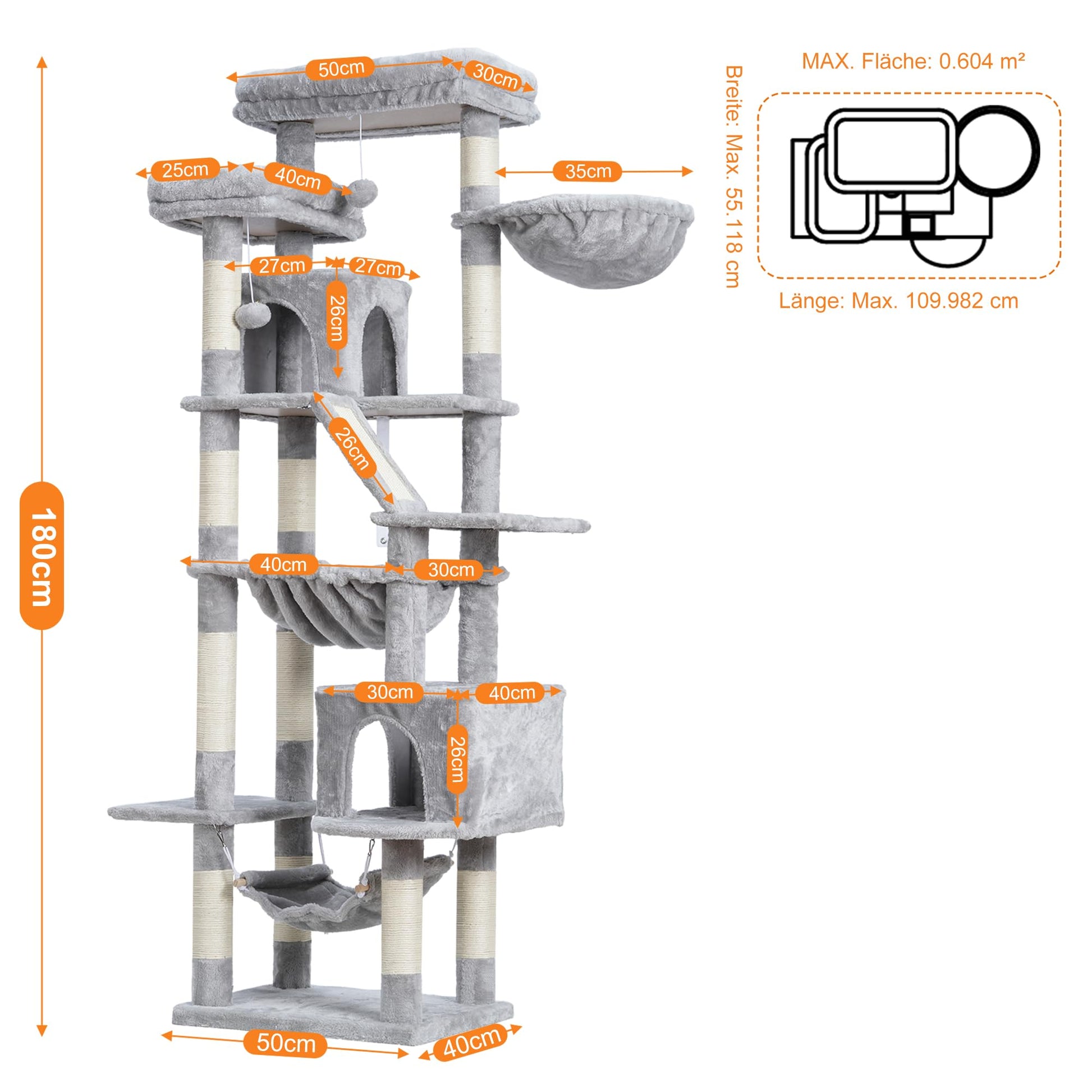 Dieser 180 cm hohe Kratzbaum bietet Ihrer Katze ein vielseitiges Paradies zum Klettern, Spielen und Entspannen. Er wurde speziell entwickelt, um die natürlichen Instinkte von Wohnungskatzen zu befriedigen und ihnen einen eigenen, abwechslungsreichen Rückzugsort zu schaffen.
