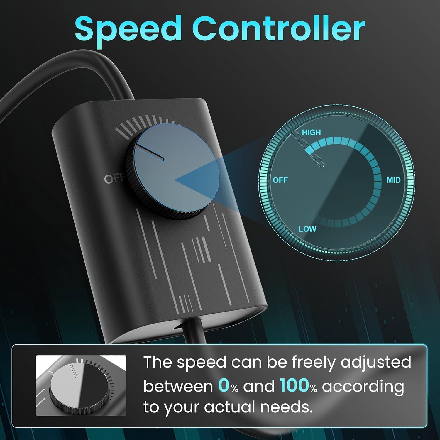 - Variable Geschwindigkeit: Ein stufenloser Drehzahlregler ermöglicht die präzise Anpassung der Lüfterleistung an Ihre Bedürfnisse.