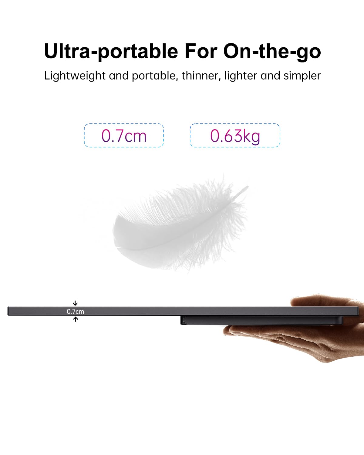 - Design: Ultra-schlankes Gehäuse (0,634 kg), integrierter Klappständer und VESA-Montagemöglichkeit.