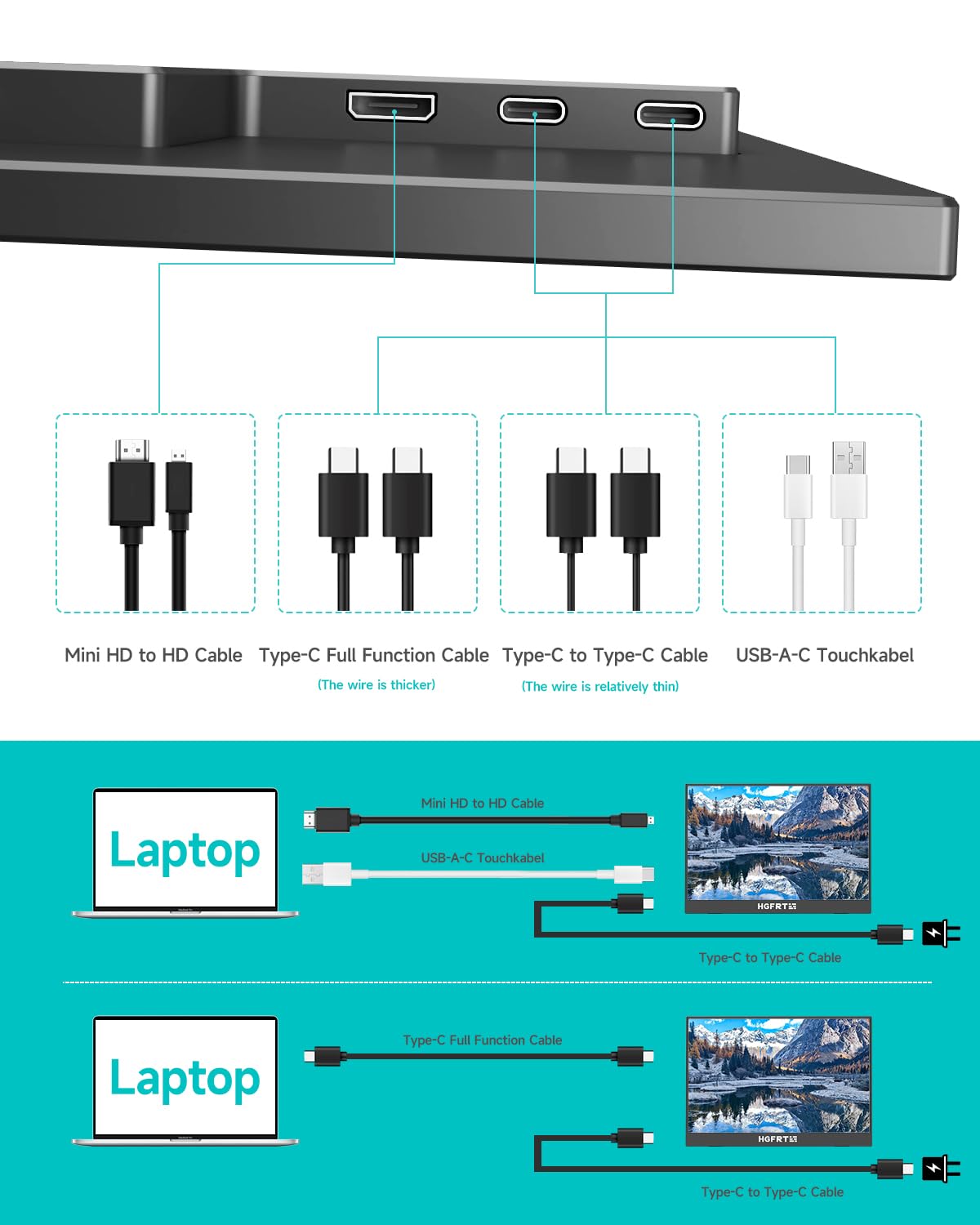 Umfassende Kompatibilität: Verbinden Sie Laptops, PCs, Spielkonsolen und andere Geräte mühelos. Ein einziges USB-C-Kabel genügt für die Übertragung von Video, Touch-Signalen und Strom (vorausgesetzt, Ihr Gerät unterstützt dies). Alternativ können Sie Bild via Mini-HDMI und die Touch-Funktion über ein separates USB-Kabel nutzen, was maximale Flexibilität gewährleistet.