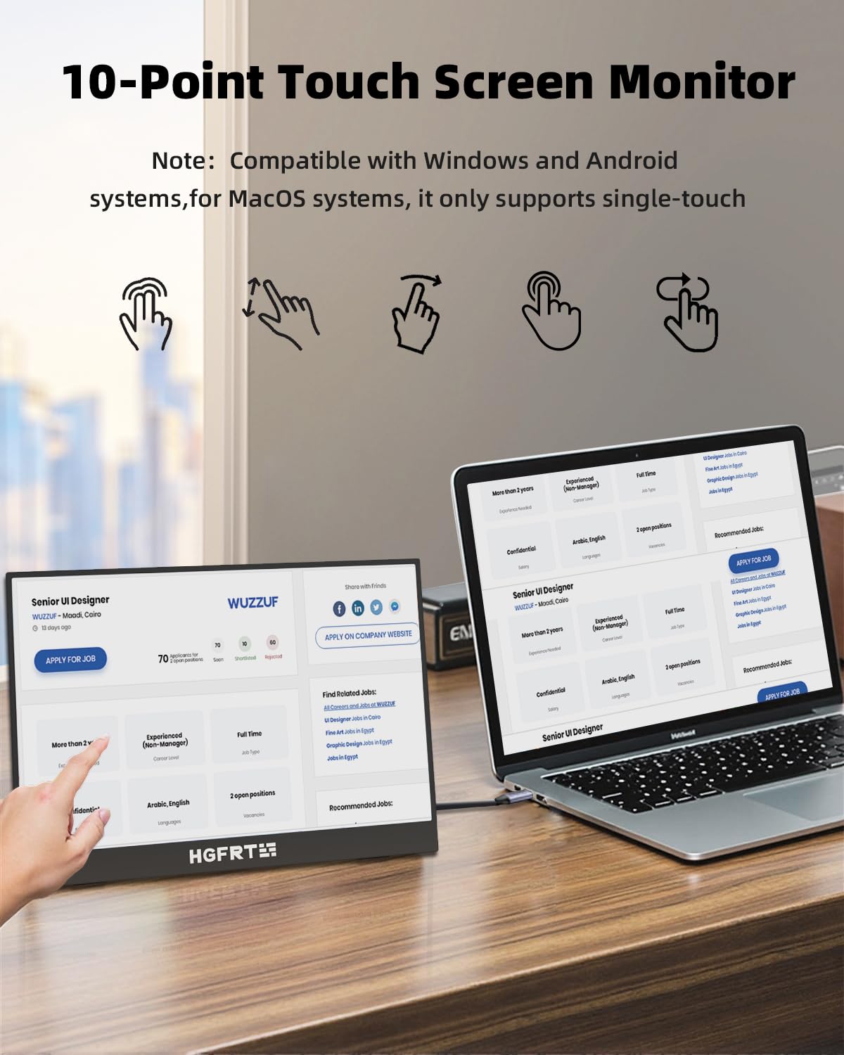 Der 10-Punkt-Touchscreen ist für eine nahtlose Interaktion mit Windows- und Android-Geräten optimiert. Bei macOS ist die native Unterstützung für externe Touchscreens systembedingt eingeschränkt; für eine vollumfängliche Multi-Touch-Funktionalität sind eventuell Treiber von Drittanbietern erforderlich.