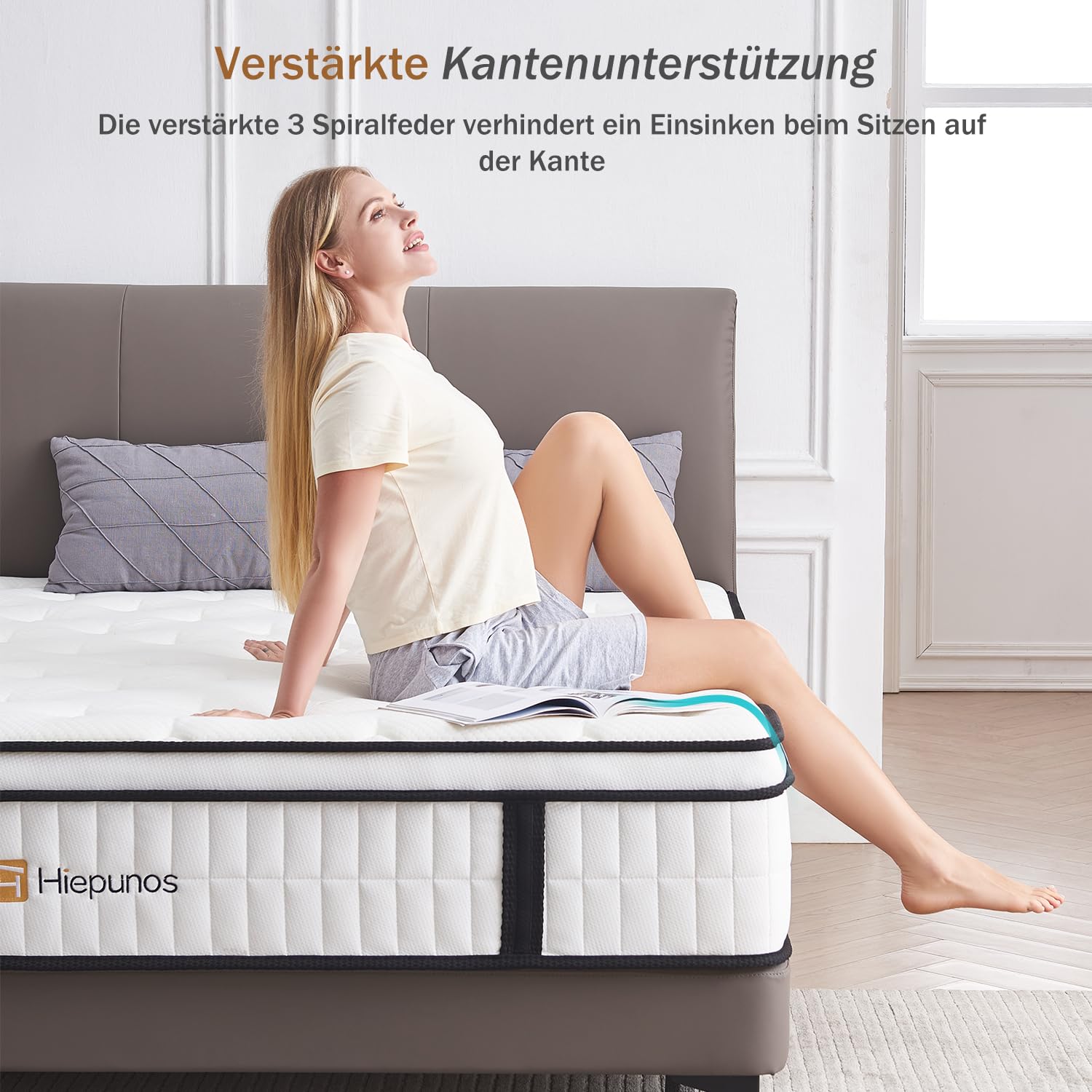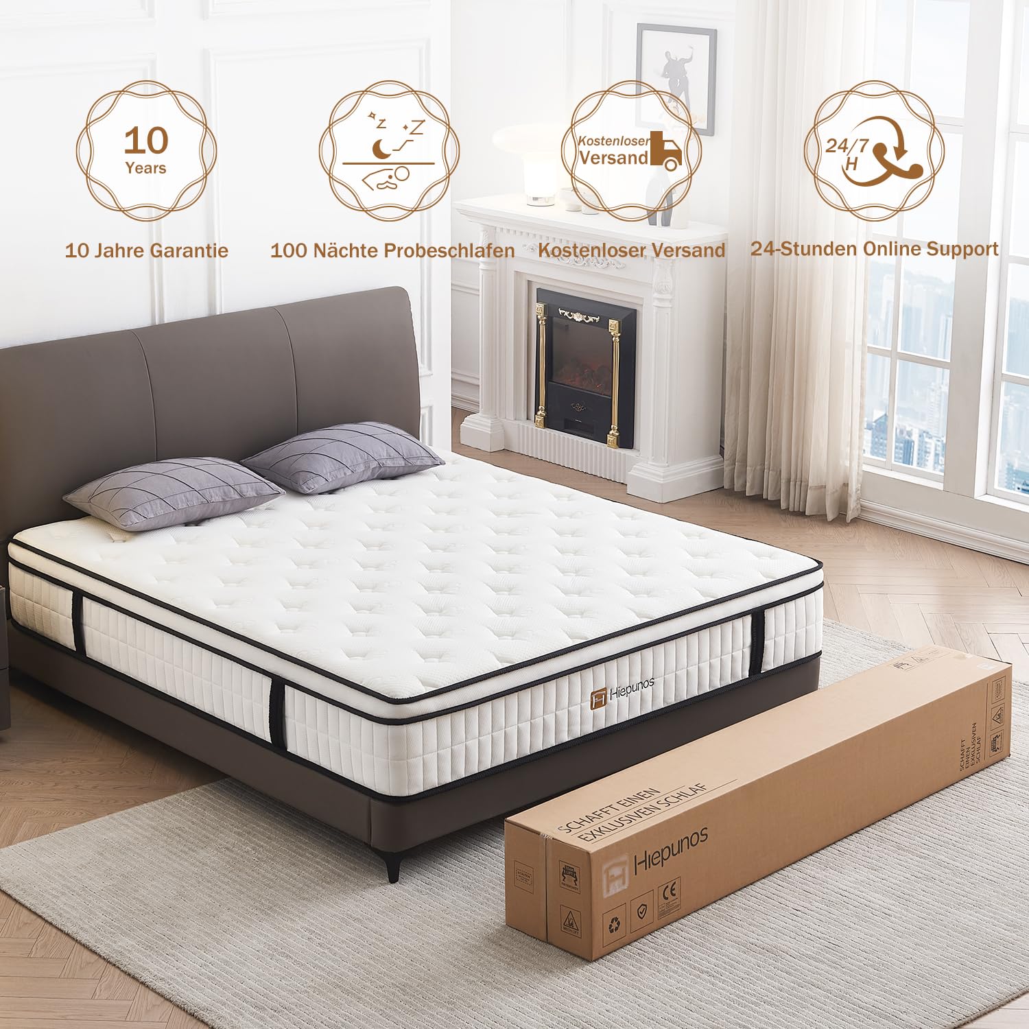 - Aufbau: Hybrid-Matratze mit 7-Zonen-Taschenfederkern und Komfortschicht aus Memory-Schaum.