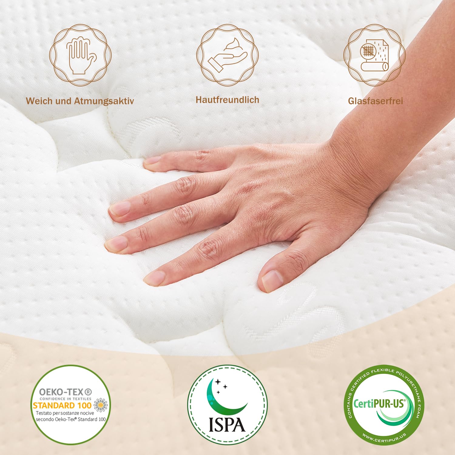 - Materialien: Hochwertige, atmungsaktive Komponenten, zertifiziert nach Öko-Tex und CertiPUR-US Standards für einen gesunden Schlaf ohne Schadstoffe.