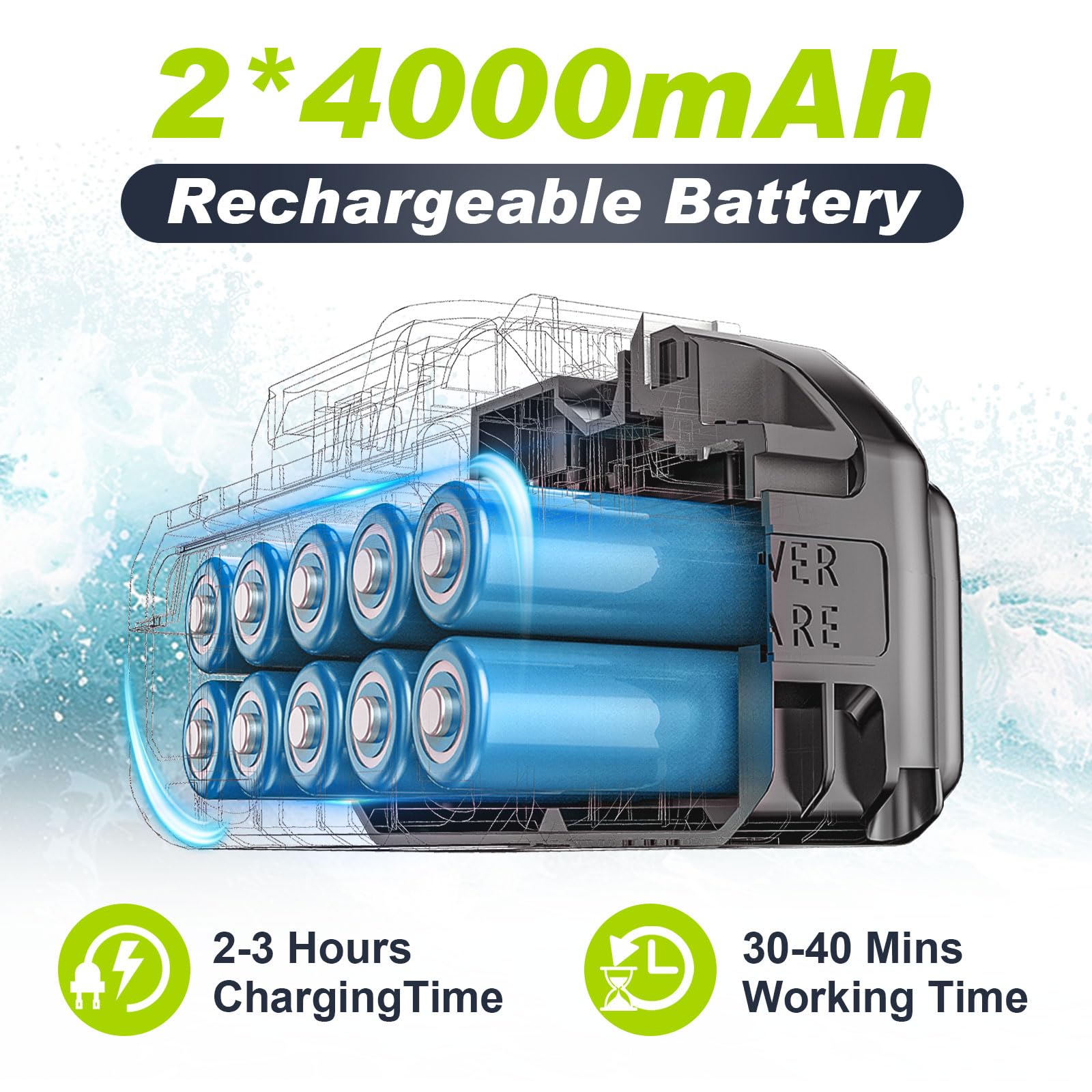 - Zwei Hochleistungs-Akkus: Im Lieferumfang sind zwei 4.0Ah Akkus enthalten, die eine Betriebsdauer von 30-40 Minuten ermöglichen und in nur 2-3 Stunden wieder aufgeladen sind.