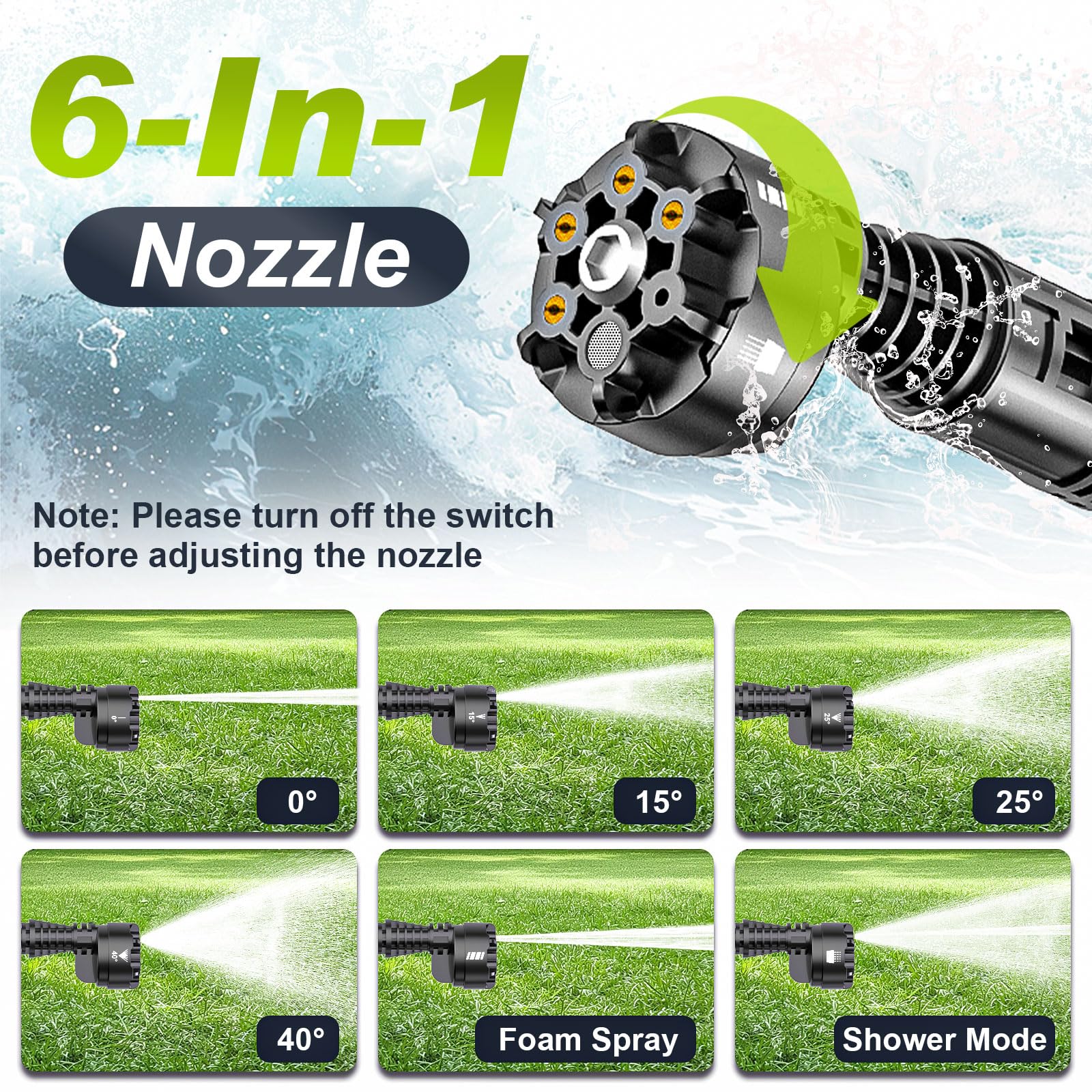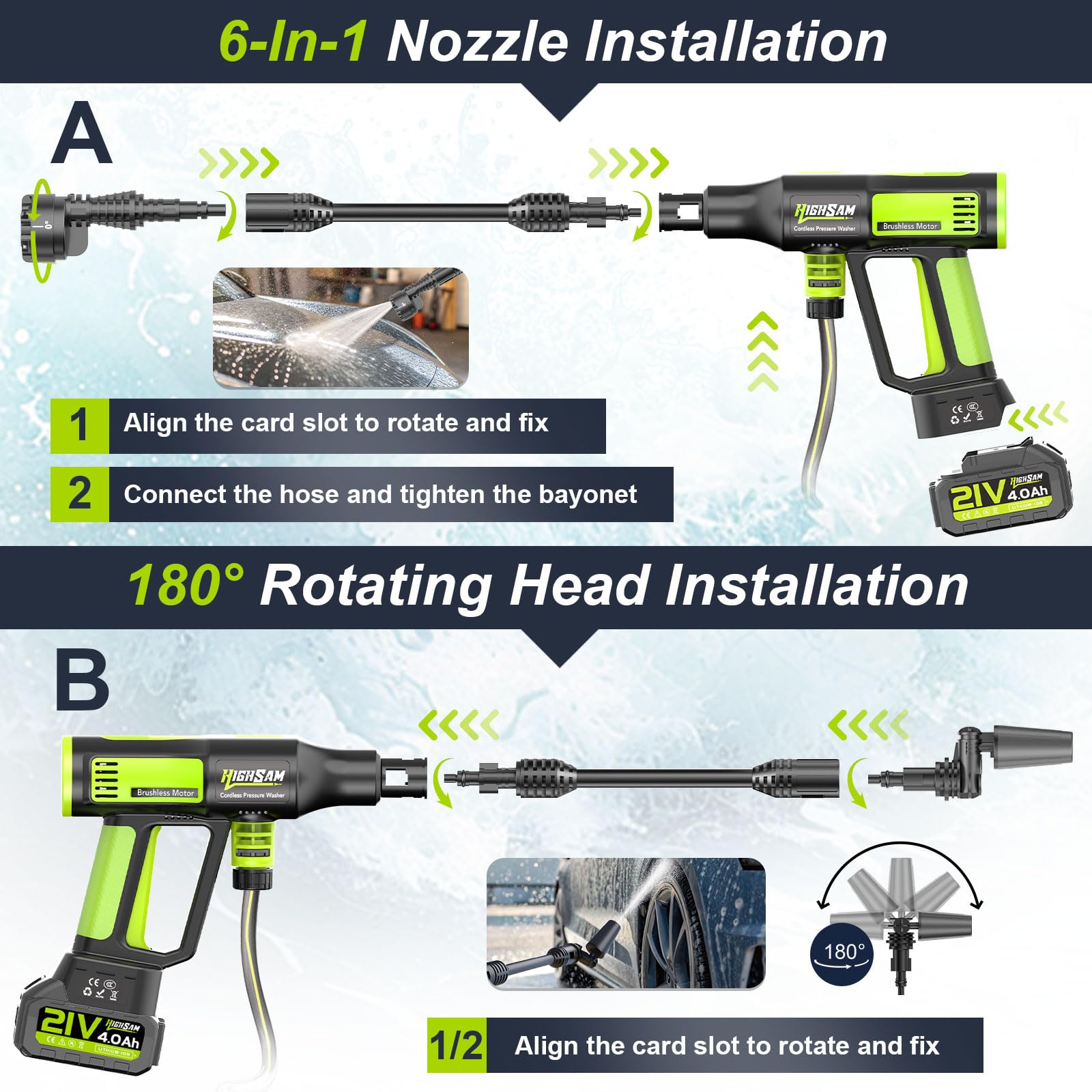 - Vielseitige Düsenaufsätze: Eine 6-in-1-Multifunktionsdüse sowie eine um 180° drehbare Düse sorgen dafür, dass Sie jeden Winkel und jede Oberfläche optimal bearbeiten können.