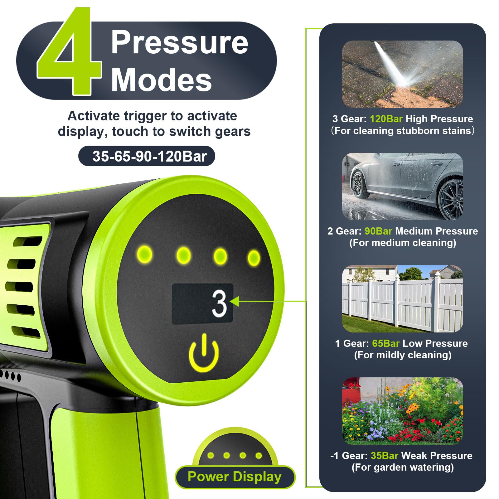 Ja, der maximale Druck von 120 Bar und ein Wasserdurchfluss von bis zu 600 l/h sind sehr kraftvoll. Sie können die Leistung über vier Stufen per Touchscreen anpassen – ideal für alles von der sanften Fahrzeugwäsche bis zur Beseitigung von hartnäckigem Schmutz auf Terrassen.