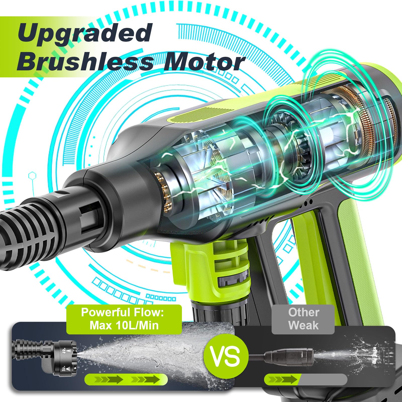 - Leistungsstarker bürstenloser Motor: Erzeugt einen maximalen Druck von 120 Bar und einen Wasserdurchfluss von bis zu 600 Litern pro Stunde für eine effiziente Reinigung.