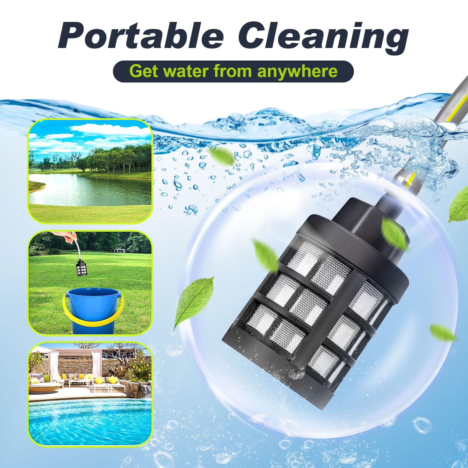 - Flexible Wasserversorgung: Der 5 Meter lange Schlauch mit integriertem Filter ermöglicht das Ansaugen von Wasser aus beliebigen Quellen wie Eimern, Seen oder Pools.
