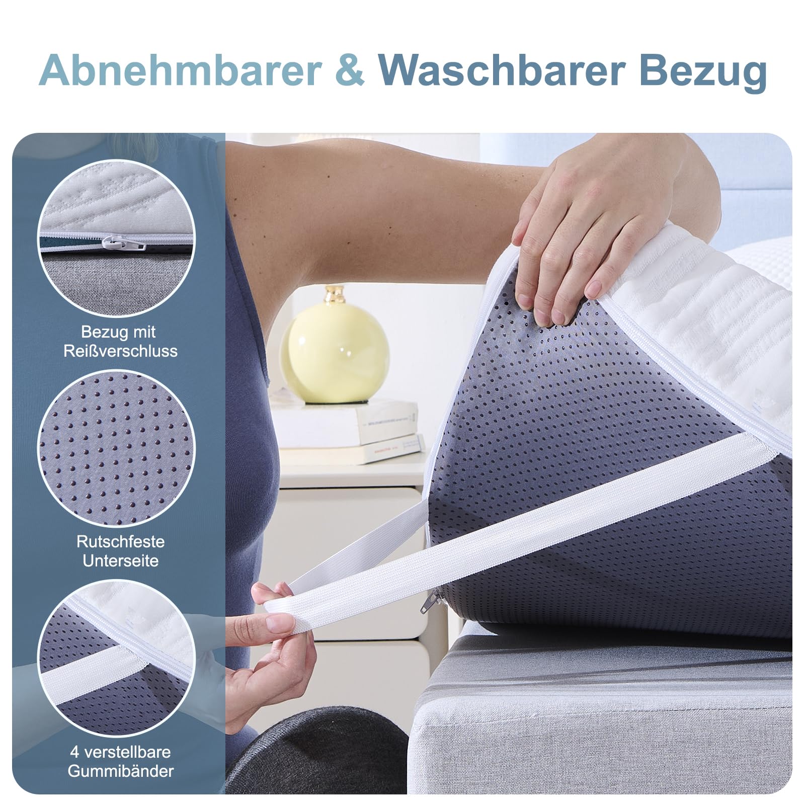 Dank des durchdachten Designs bleibt der Topper auch bei unruhigen Schläfern sicher an seinem Platz. Der hochwertige Bezug verleiht Ihrer Matratze nicht nur ein modernes Aussehen, sondern ist dank Reissverschluss auch besonders pflegeleicht. Waschen Sie ihn einfach in der Maschine, um dauerhafte Frische und Hygiene zu gewährleisten.