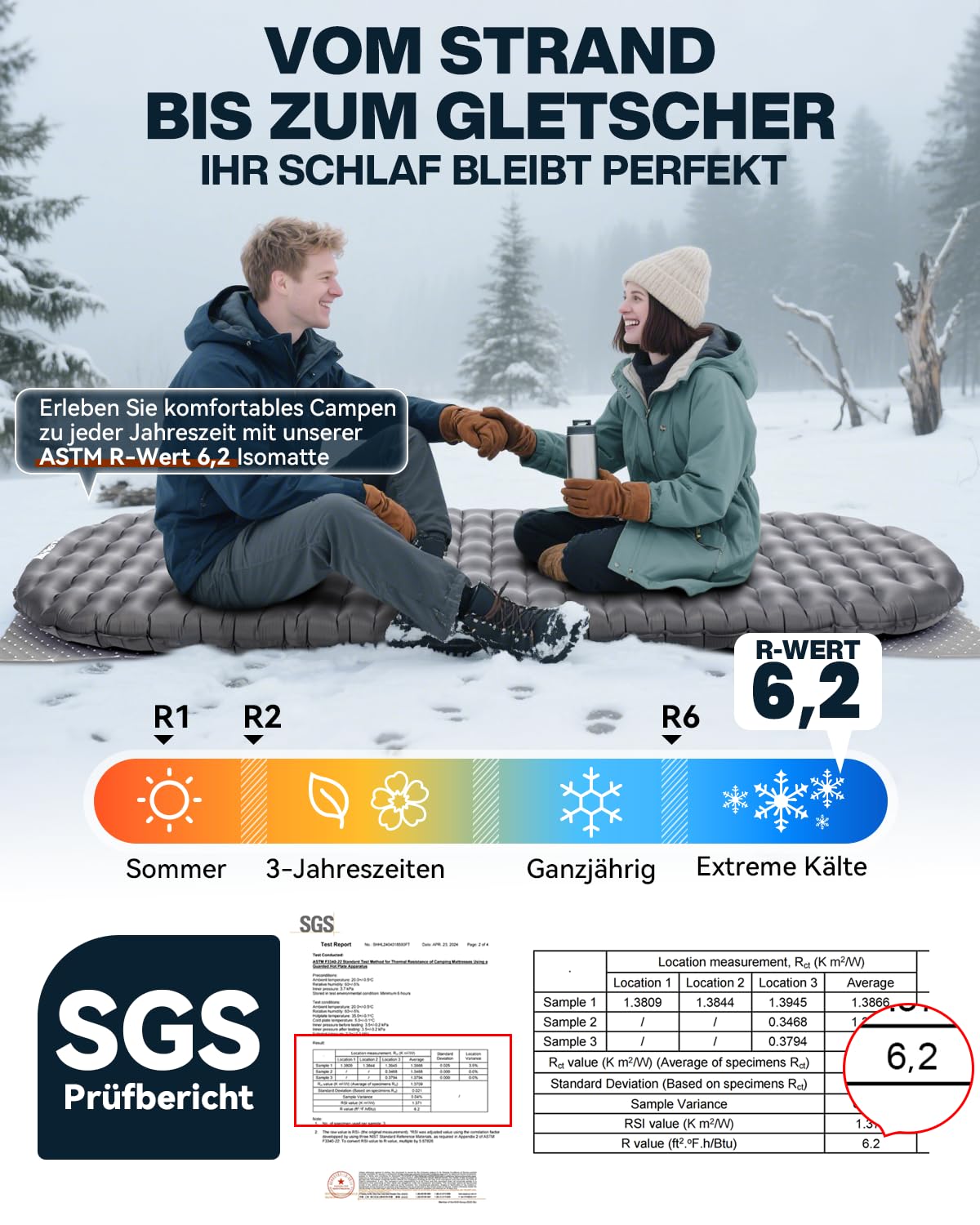 Dank eines aussergewöhnlich hohen R-Werts von 6,2, getestet nach der Norm ASTM F3340-18, bietet diese Isomatte eine herausragende Isolation gegen Bodenkälte. Ob im Frühling, Sommer, Herbst oder Winter, Sie geniessen stets eine angenehme und warme Nachtruhe und sind für jedes Wetter bestens gerüstet.