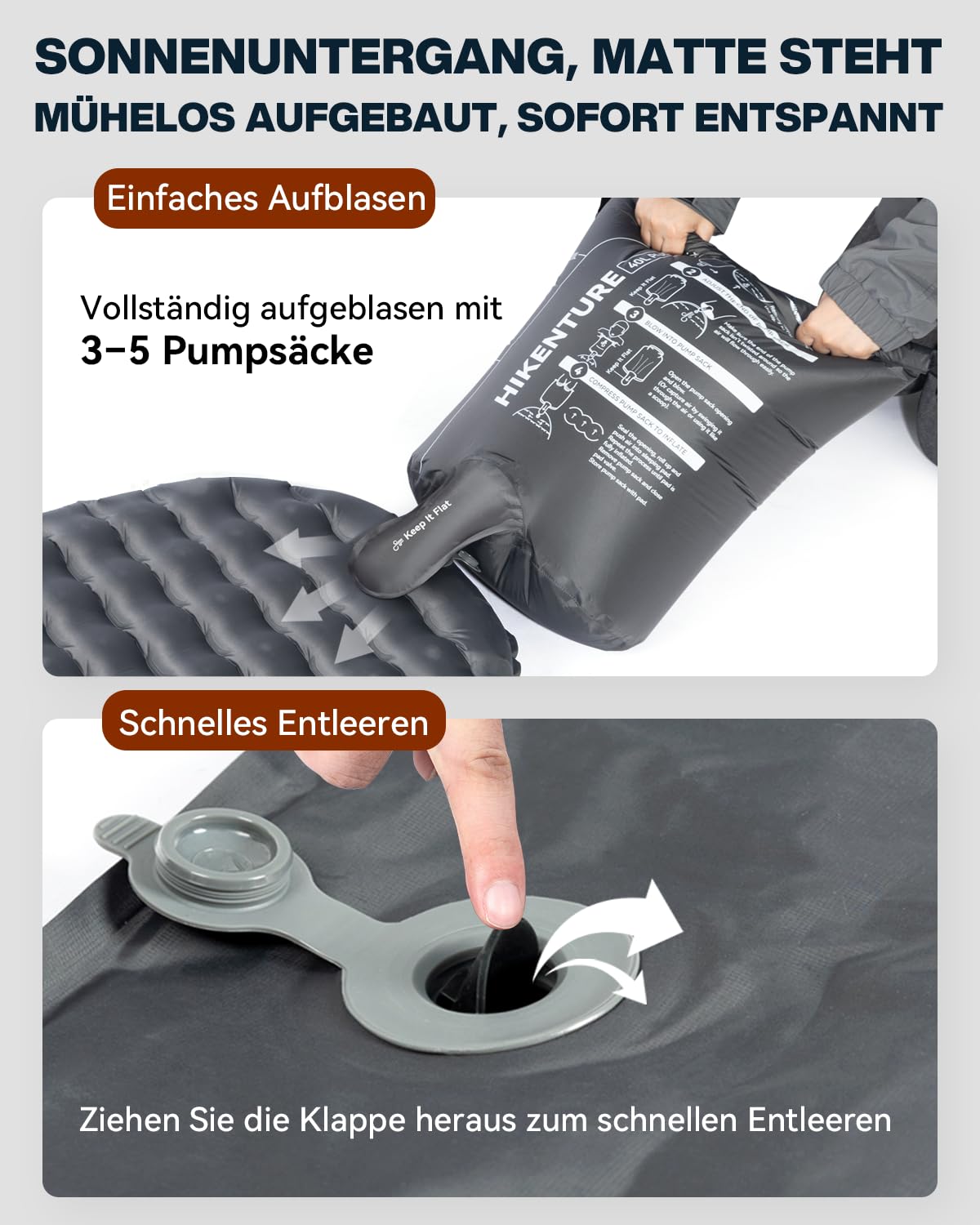 Diese ultraleichte und aufblasbare Isomatte ist Ihr zuverlässiger Begleiter für Campingabenteuer, der Sie mit herausragendem Komfort durch alle vier Jahreszeiten begleitet.