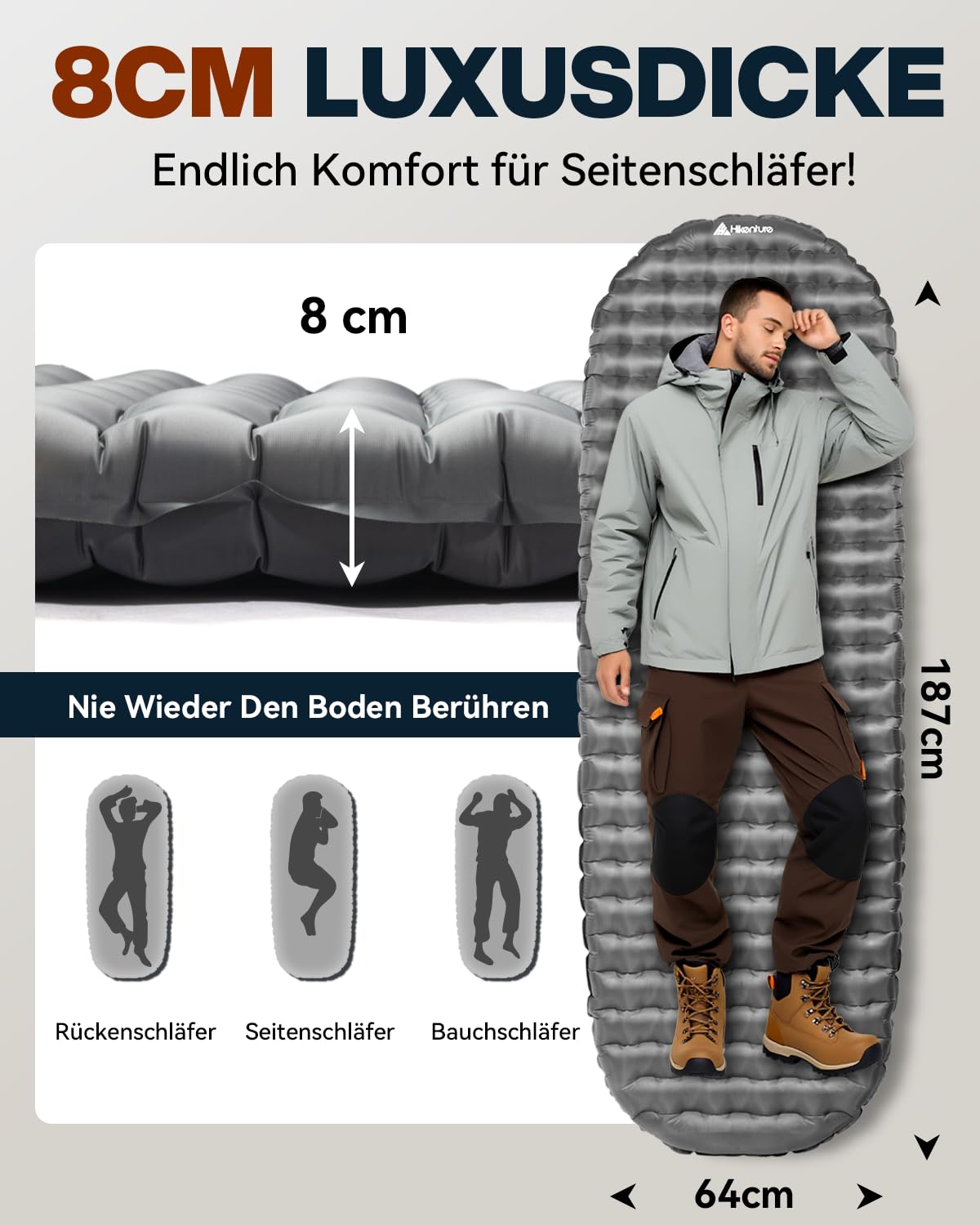 Sehr komfortabel. Mit ihrer grosszügigen Dicke von 8 cm bietet die Isomatte eine hervorragende Polsterung und stützt den Körper optimal, egal ob Sie auf der Seite, dem Rücken oder dem Bauch schlafen, und verhindert das Durchdrücken von Hüfte oder Schultern.