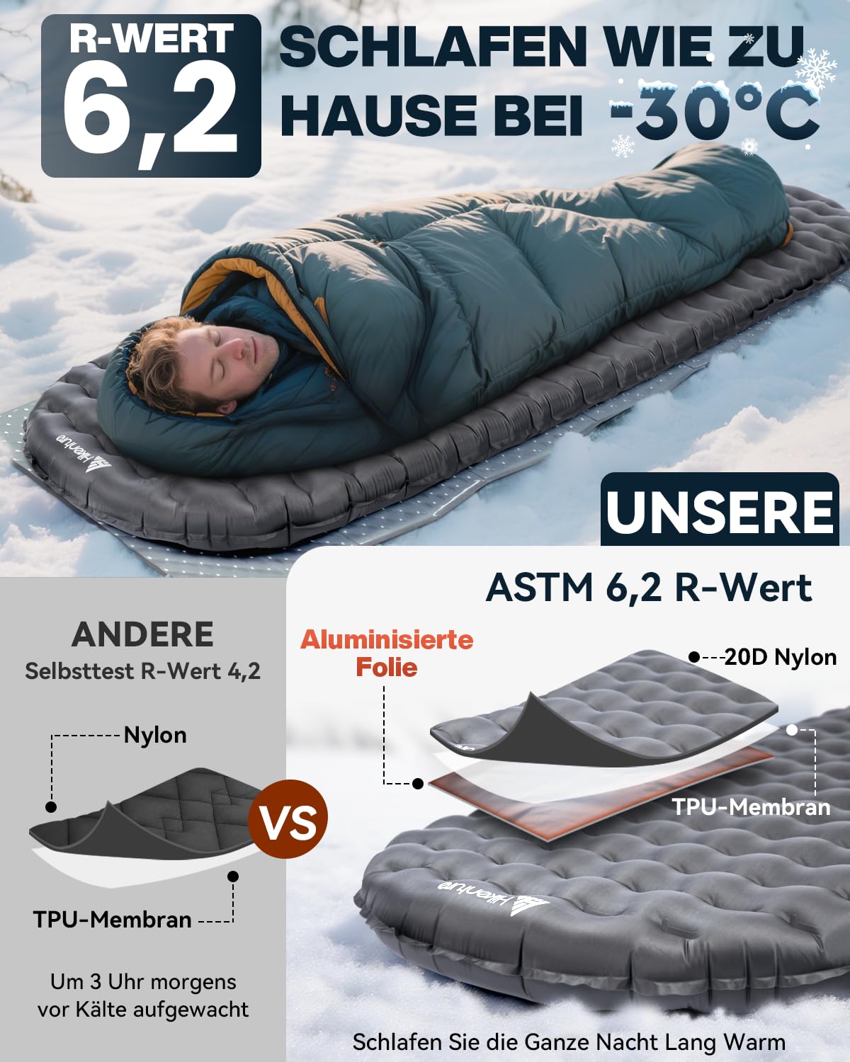 Mit einem beeindruckenden R-Wert von 6,2 bietet diese Isomatte eine herausragende Isolation. Sie begleitet Sie zuverlässig durch alle vier Jahreszeiten und sorgt selbst in kühleren Nächten für wohlige Wärme und einen ungestörten Schlaf.