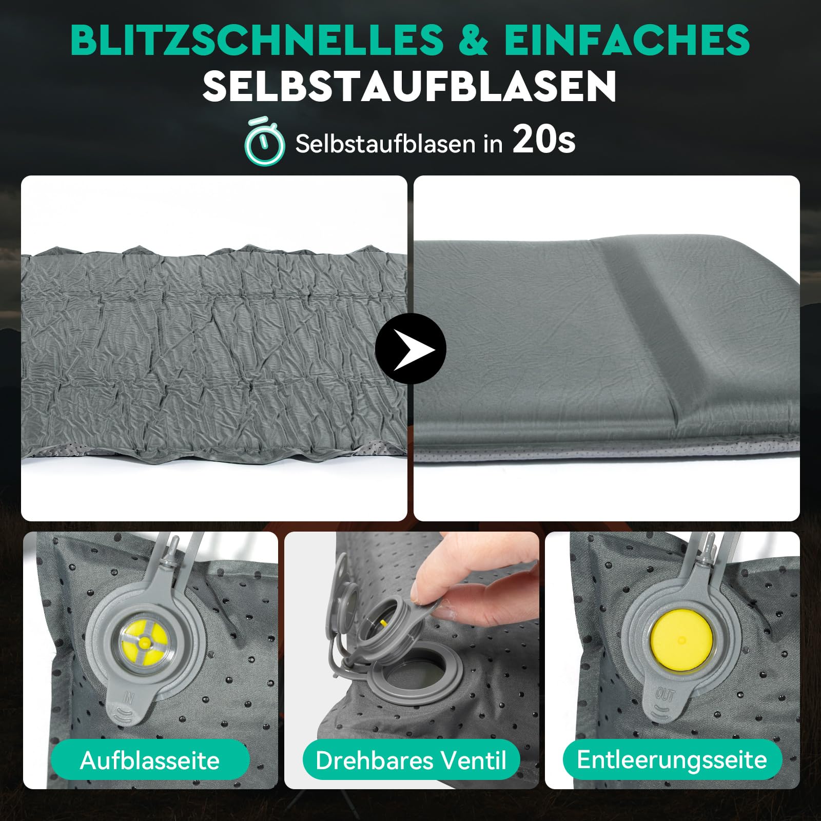 Die Matte füllt sich nach dem Öffnen des Ventils von selbst mit Luft, ganz ohne Pumpe. Für eine individuelle Härteeinstellung können Sie bei Bedarf mit wenigen Atemzügen nachhelfen, um den für Sie perfekten Liegekomfort zu erreichen.