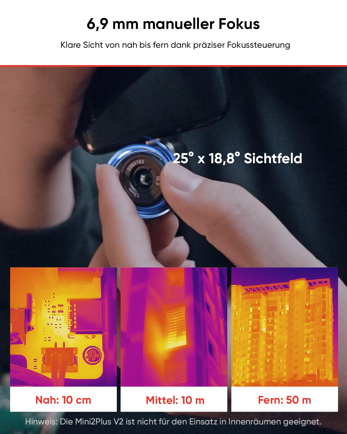 Mit einem Gewicht von nur 24 Gramm ist diese Wärmebildkamera extrem portabel und verwandelt Ihr Mobilgerät im Handumdrehen in ein leistungsstarkes Diagnoseinstrument. Sie behalten die volle Kontrolle durch den manuell einstellbaren Fokus, der besonders bei der detaillierten Inspektion von Leiterplatten oder bei der Verfolgung von Objekten im Aussenbereich über 5 Meter seine Stärken ausspielt.
