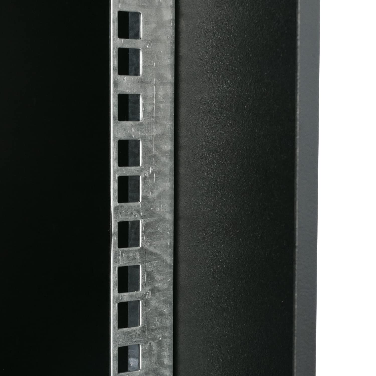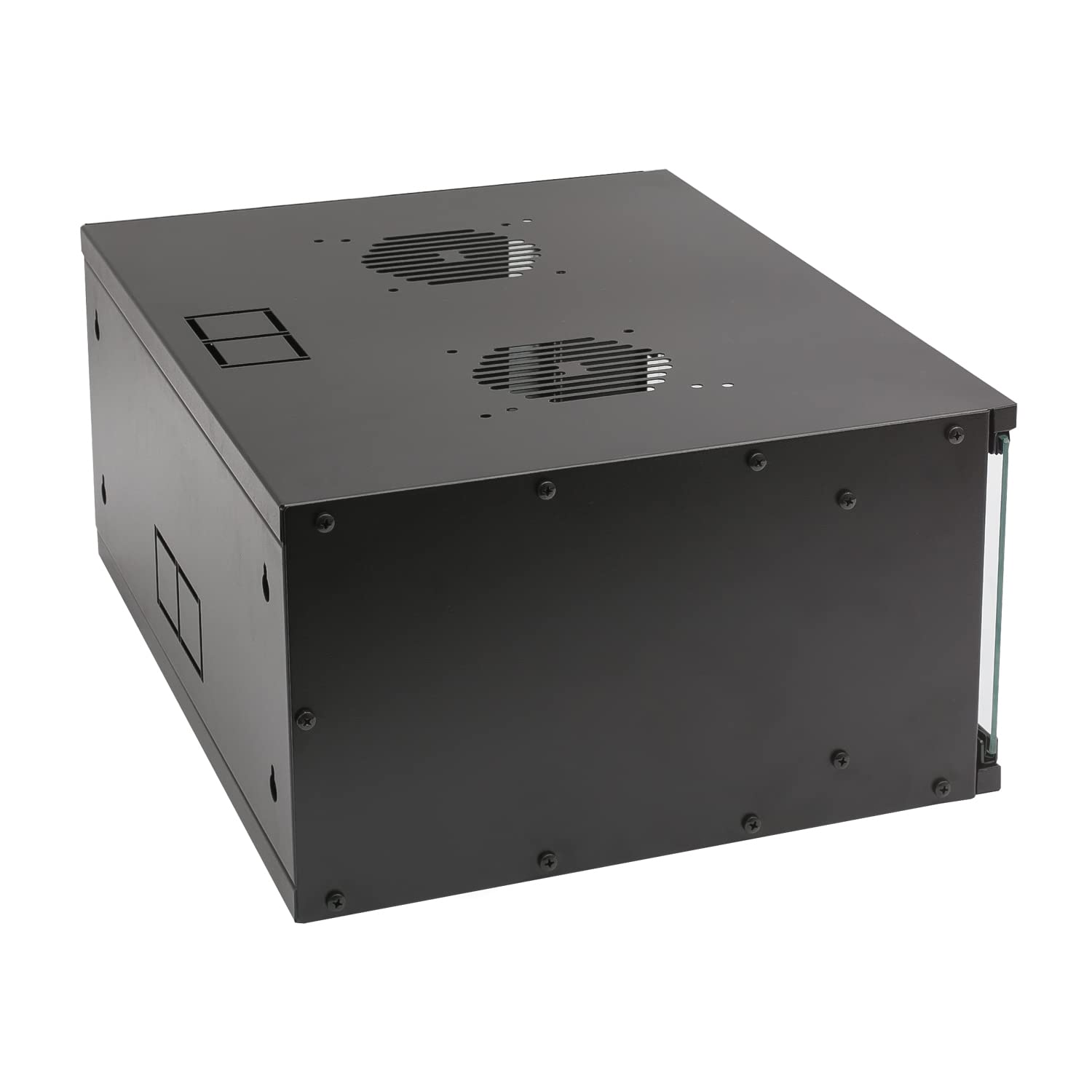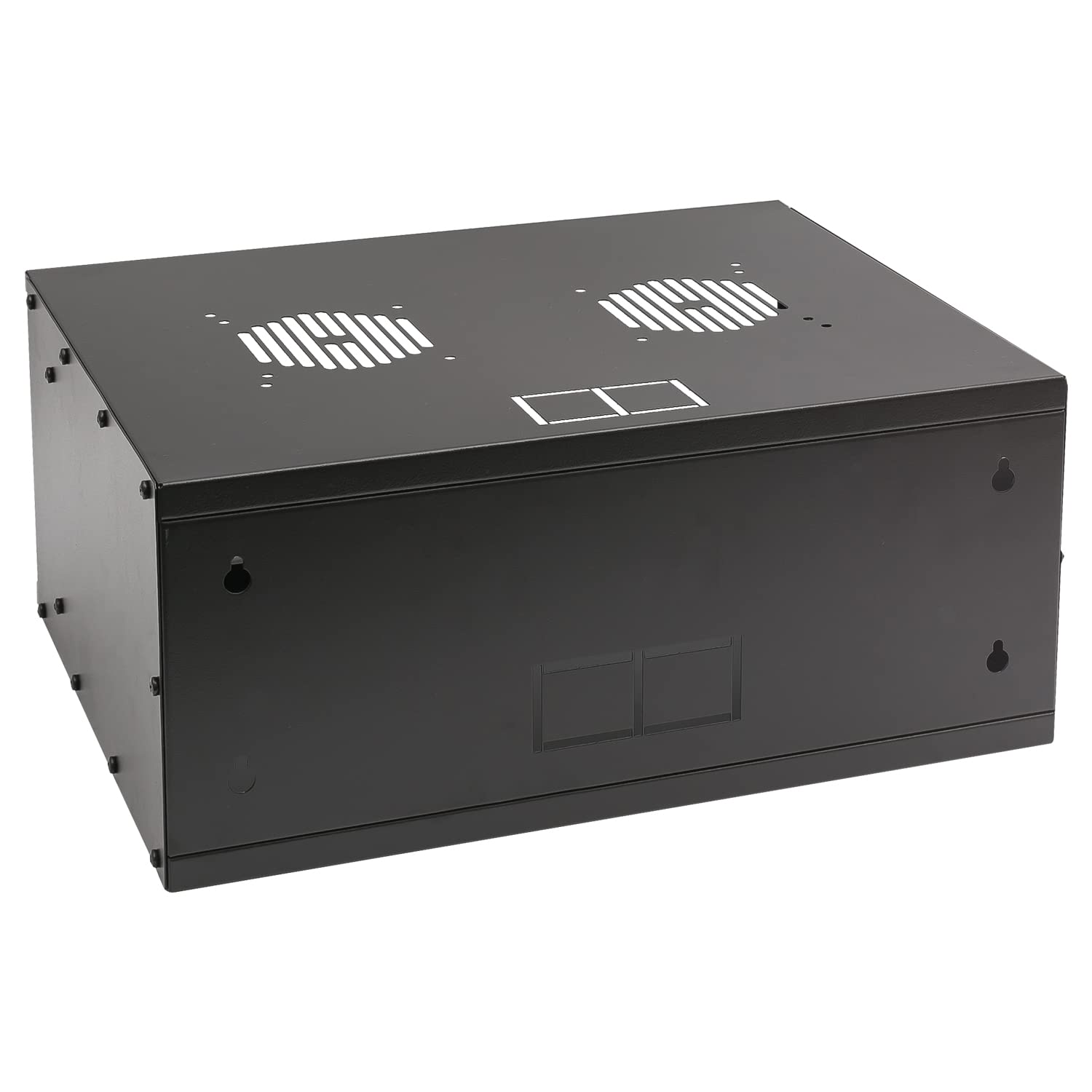 Der Netzwerkschrank verfügt über integrierte Lüftungsschlitze, die eine passive Luftzirkulation zur Kühlung Ihrer Geräte ermöglichen. Für Installationen mit höherer Wärmeentwicklung sind zudem Vorrichtungen zur optionalen Montage von Lüftern vorhanden.