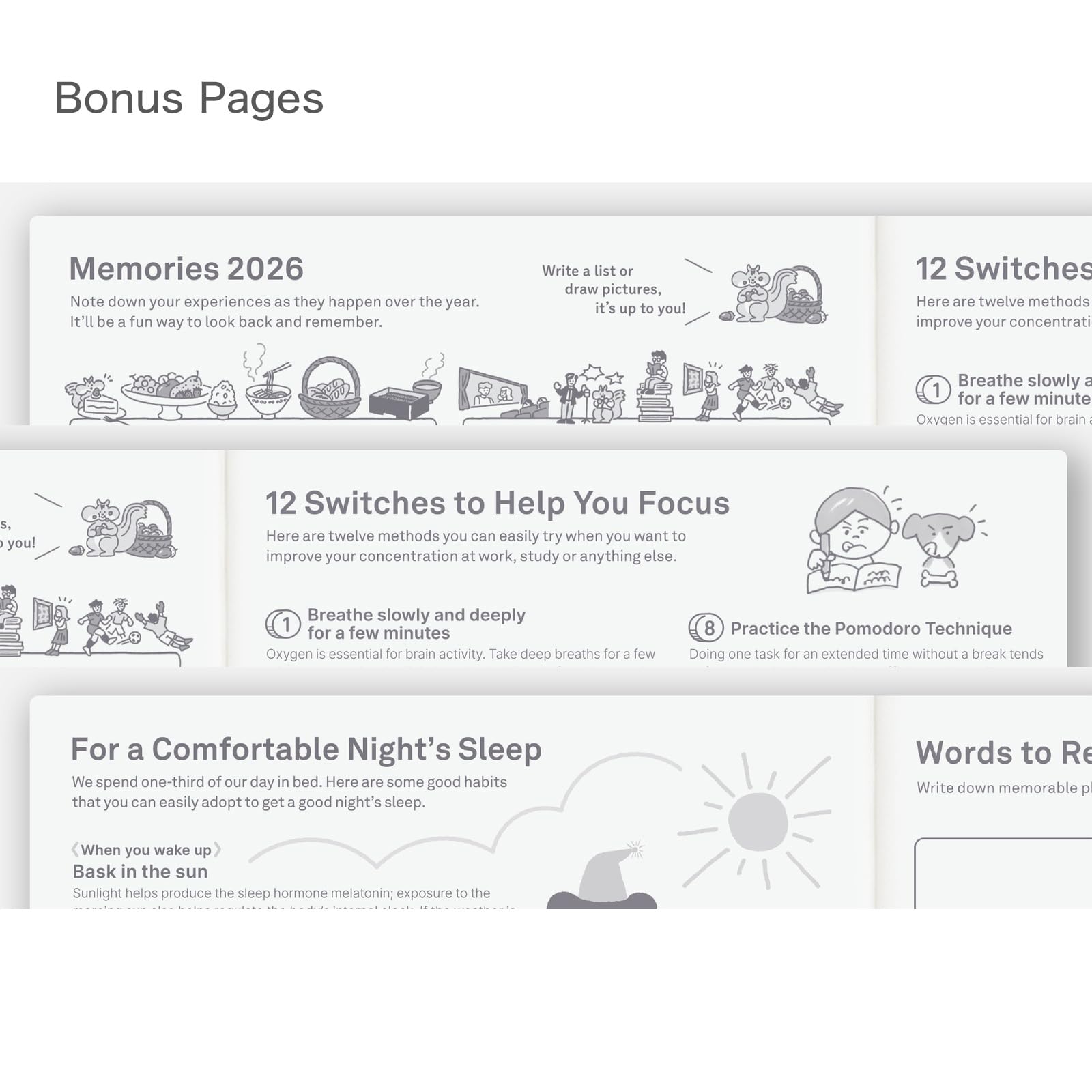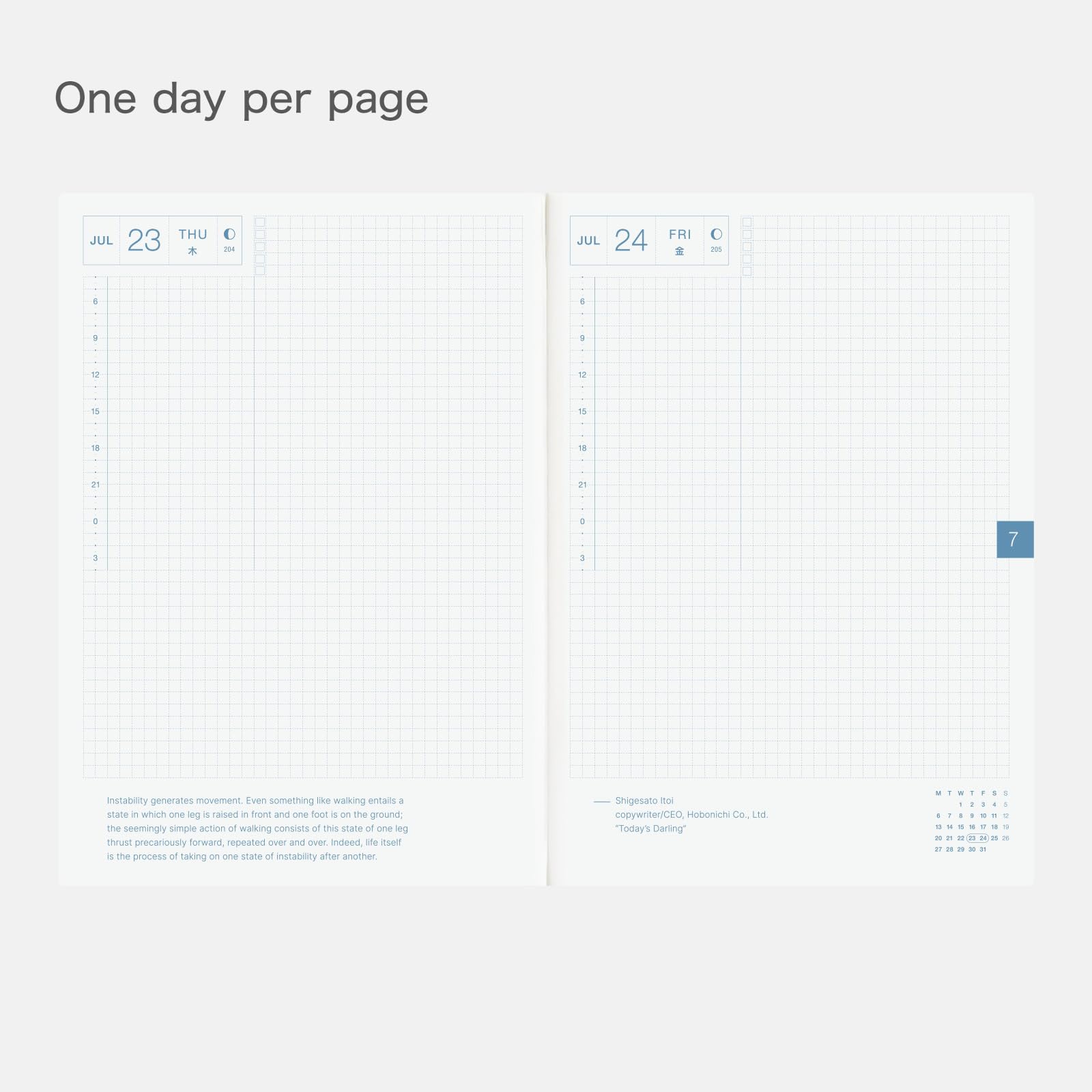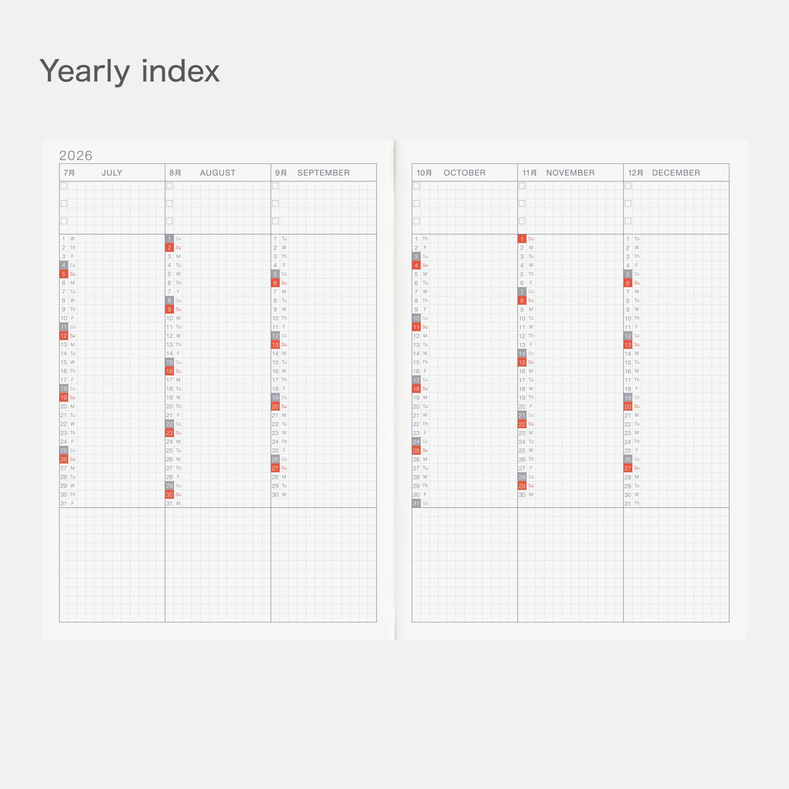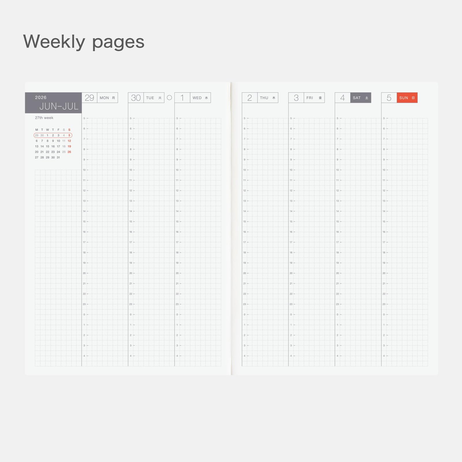 The Hobonichi Cousin is an English-language A5 planner with a comprehensive layout featuring yearly, monthly, and weekly overviews, plus a full page for each day of 2026. Its generous space makes it perfect for detailed daily planning, journaling, managing to-do lists, or as an all-in-one notebook for both professional and personal use.