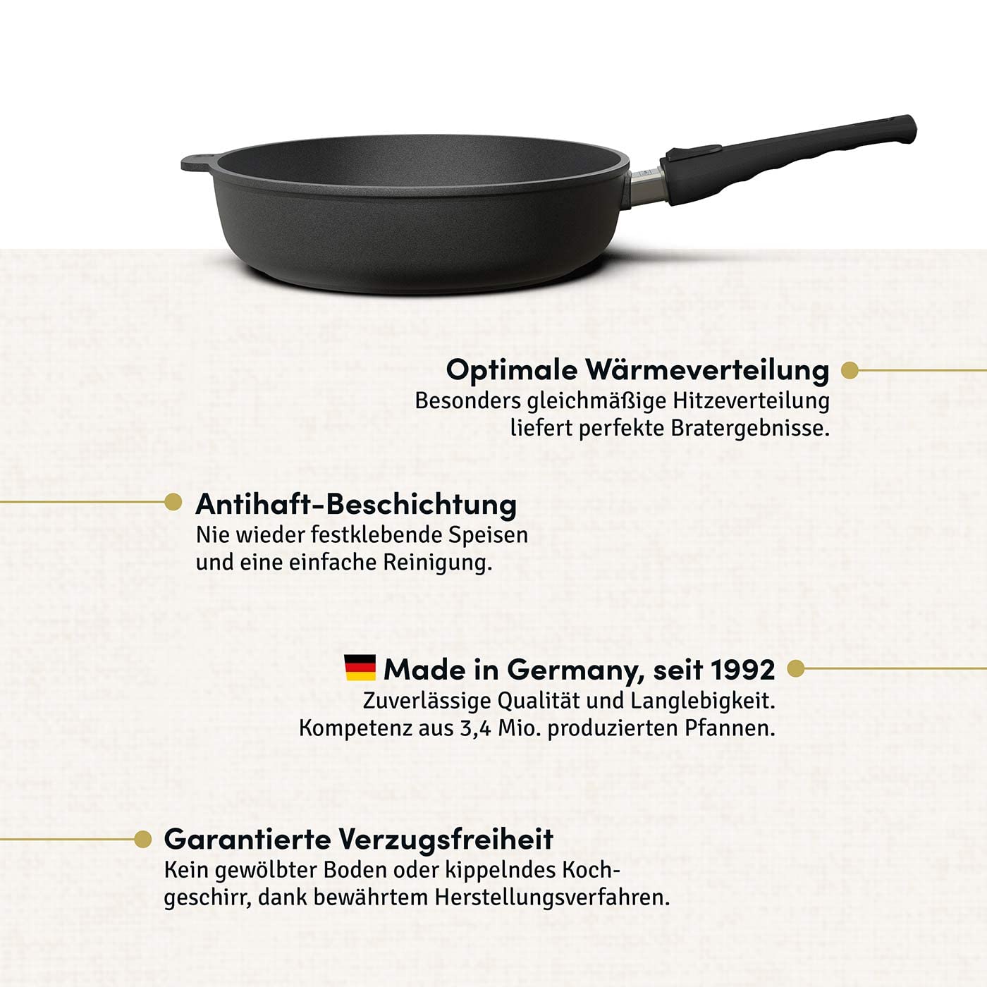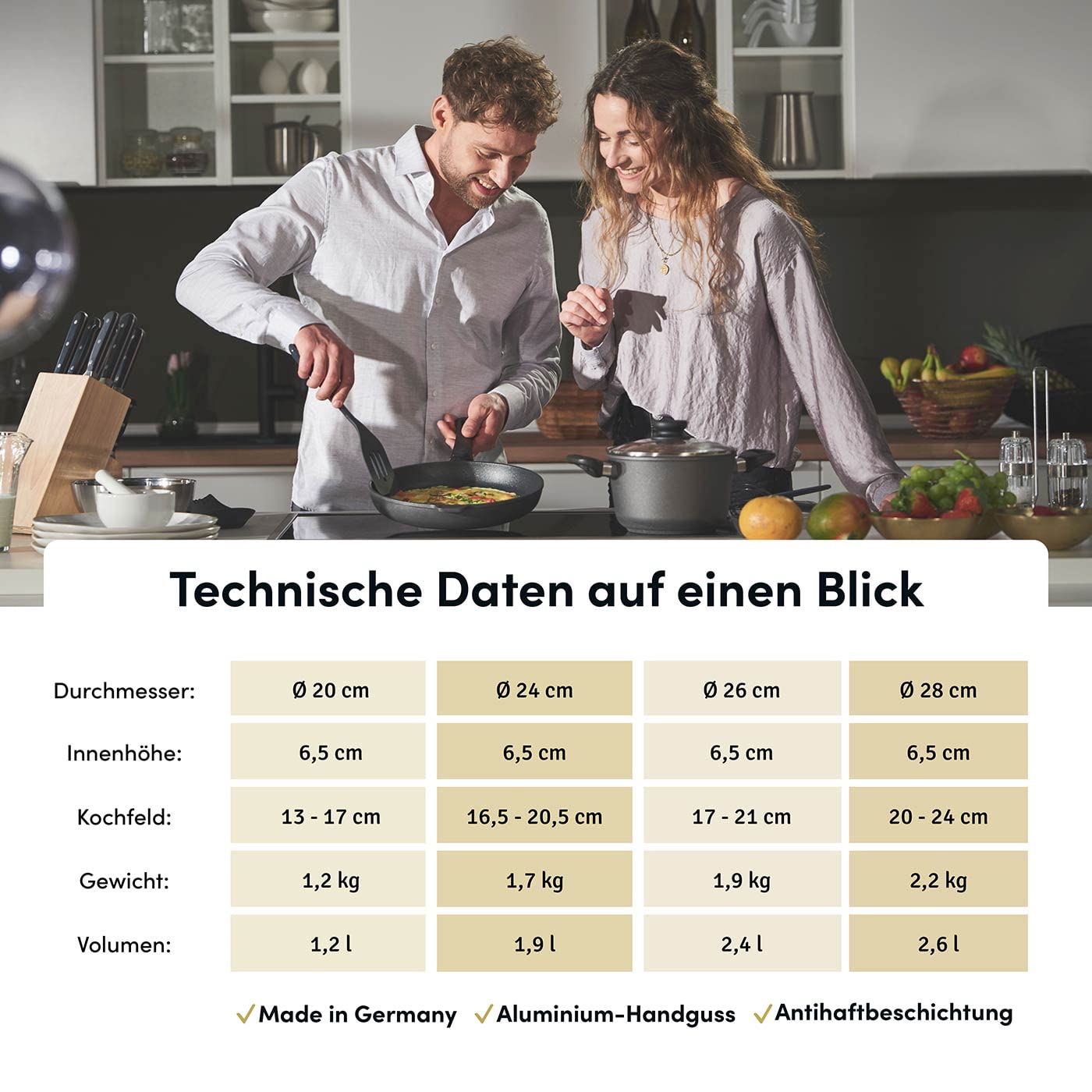 Entdecken Sie die Vielseitigkeit dieser hochwertigen Schmorpfanne aus deutschem Aluguss. Sie ist der ideale Partner für anspruchsvolle Gerichte auf allen Herdarten, inklusive Induktion, und überzeugt durch ihre durchdachte Funktionalität.