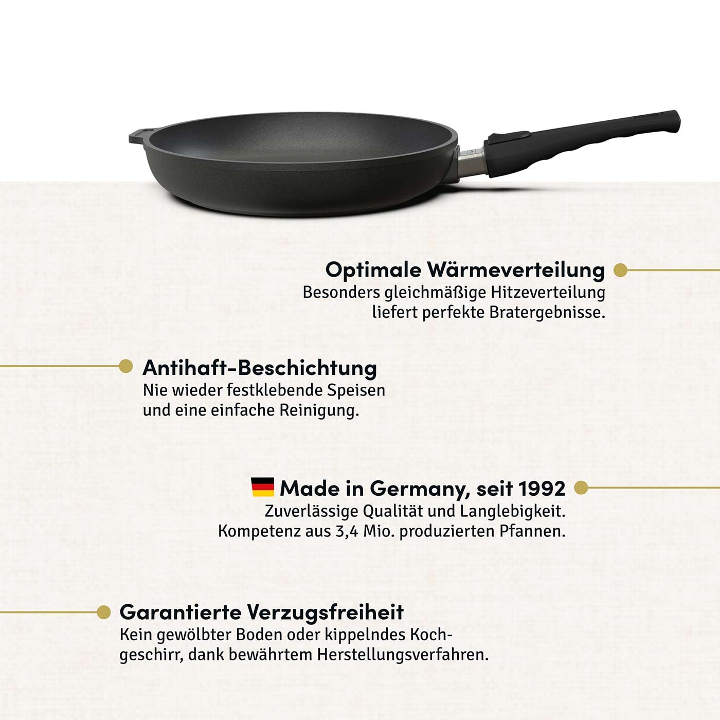 Der abnehmbare Stiel ist ein cleveres Detail: Er ermöglicht eine äusserst platzsparende Aufbewahrung und macht die Pfanne backofentauglich bis 250 °C. Beim Kochen auf dem Herd erwärmt sich der Griff nicht mit, wodurch jede Verbrennungsgefahr ausgeschlossen ist.