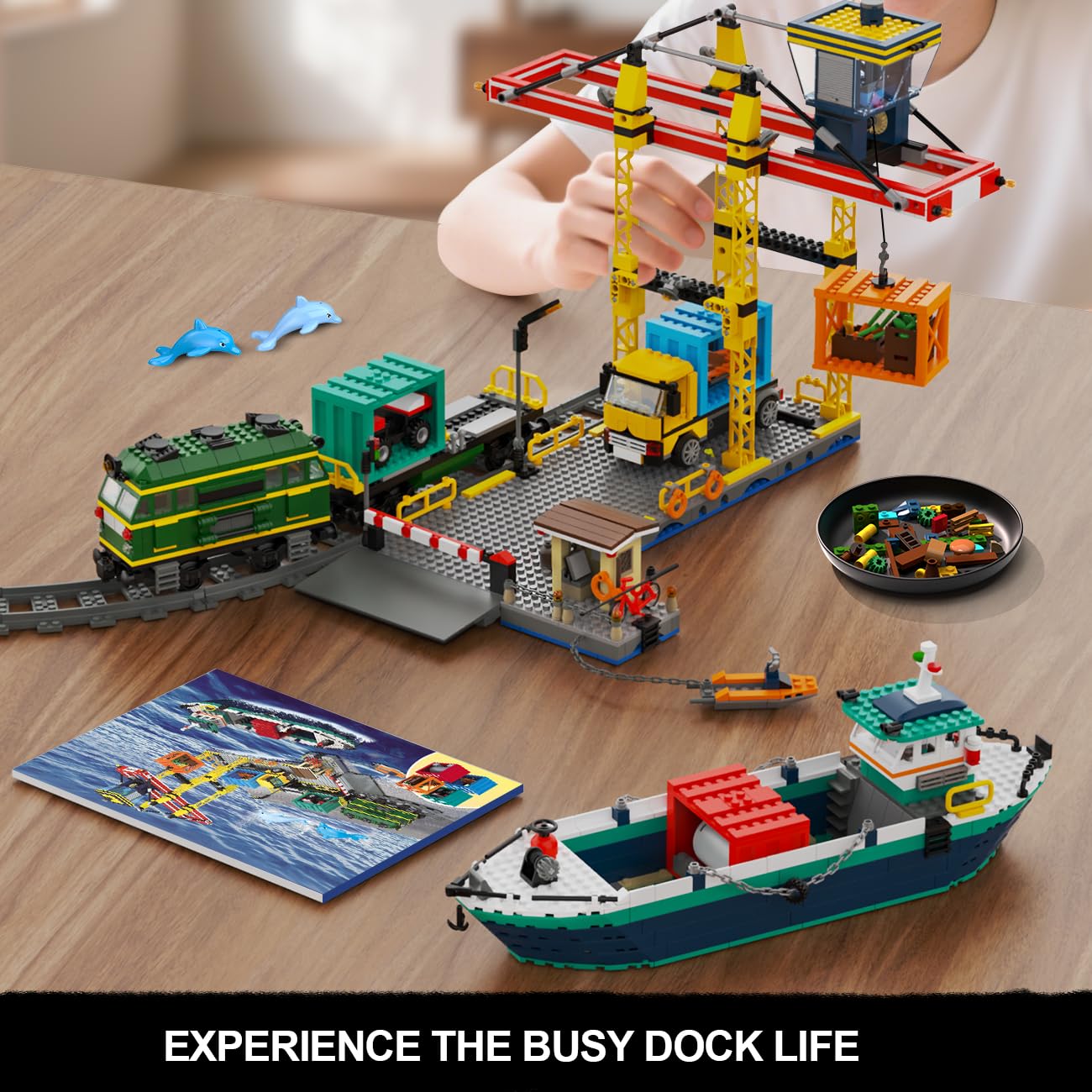 Das Set ist ein komplettes Hafenszenario mit 1373 Teilen. Es beinhaltet ein grosses Frachtschiff (38 cm lang), einen Zug, einen Lastwagen, einen funktionsfähigen Containerkran und vier verschiedene Frachtcontainer mit Ladung (Mini-Yacht, Auto, Benzintank und Gemüse).
