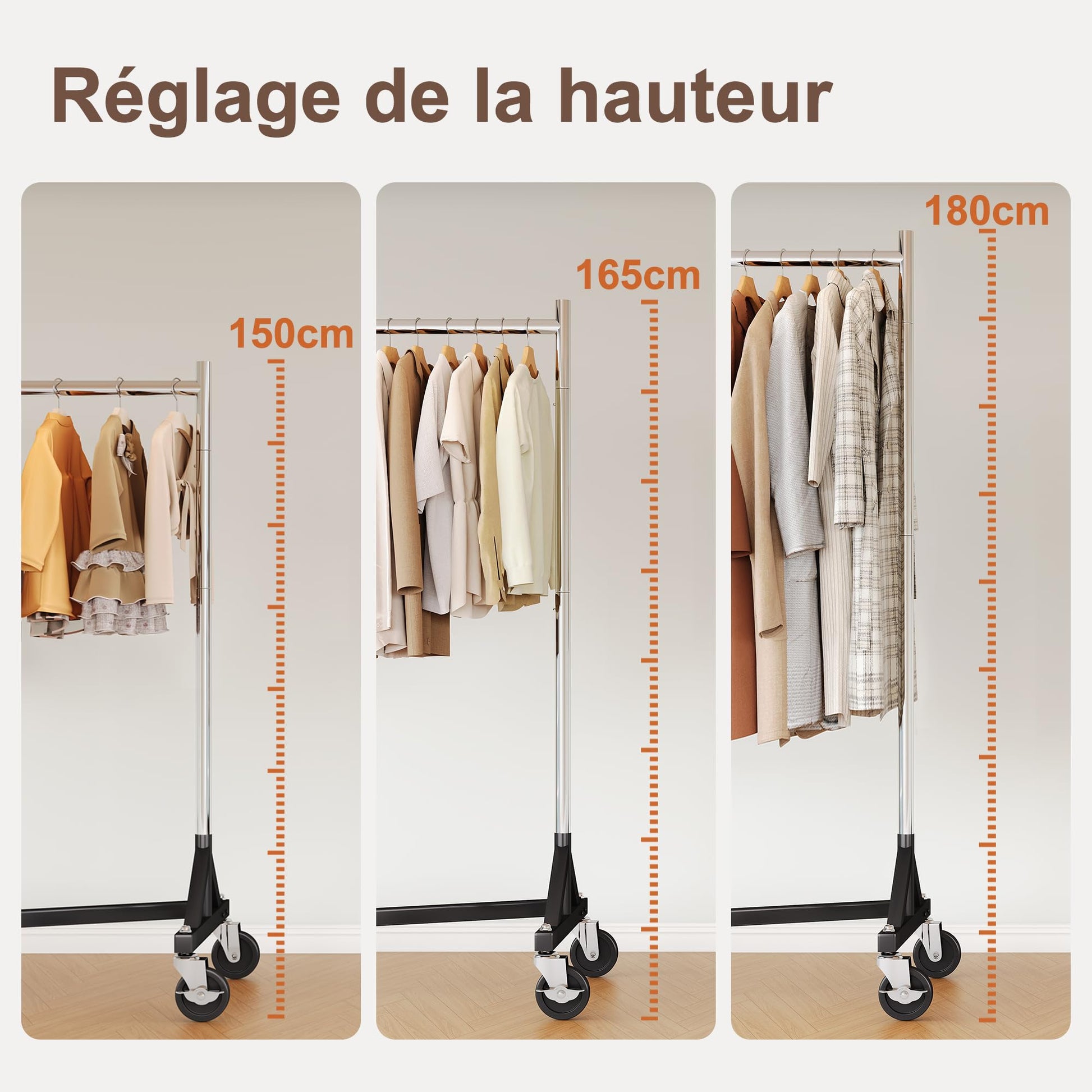 - Flexible Höhe: Die Kleiderstange ist dreistufig höhenverstellbar (150 cm, 165 cm, 180 cm) und eignet sich so perfekt für lange Mäntel, Kleider und andere Kleidungsstücke.