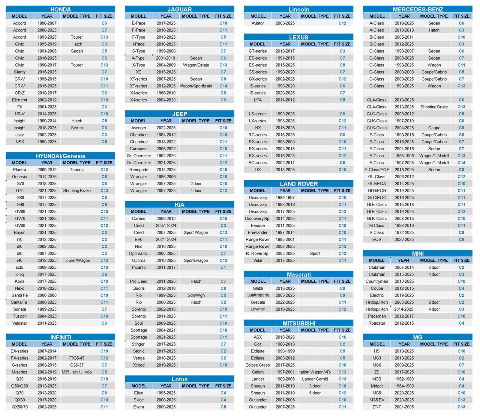Die exakt passende Grösse für Ihr Fahrzeugmodell und Baujahr finden Sie in der detaillierten Grössentabelle in den Produktbildern. Um eine bessere und straffere Passform für eine Vielzahl von Modellen zu gewährleisten, wird bei einigen Grössen bewusst auf Spiegeltaschen verzichtet.