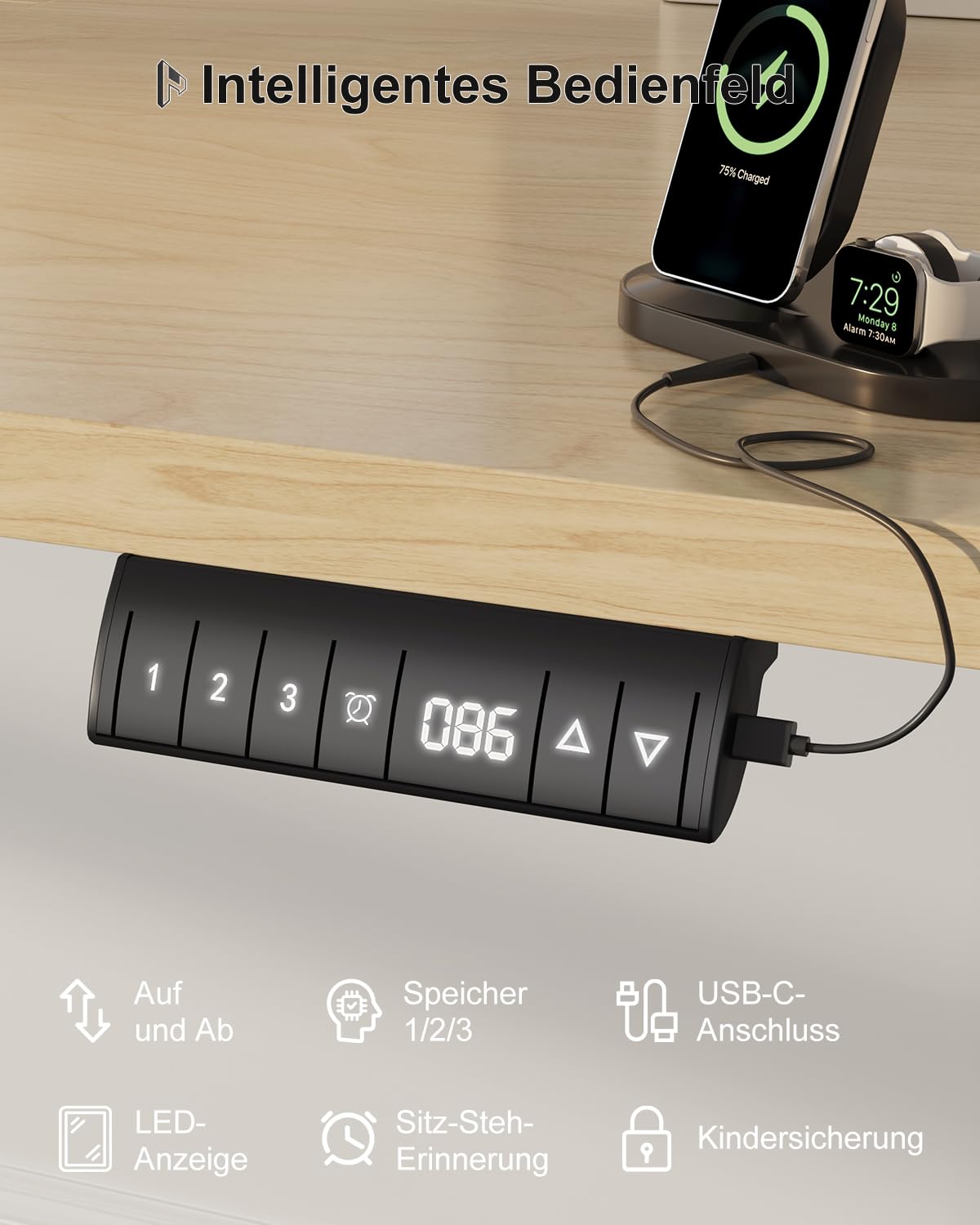 - Intuitive Memory-Funktion: Speichern Sie bis zu drei individuelle Höhen ab und wechseln Sie per Knopfdruck mühelos zwischen Ihren bevorzugten Sitz- und Stehpositionen. Die Höhe lässt sich stufenlos von 72 cm bis 116 cm verstellen.