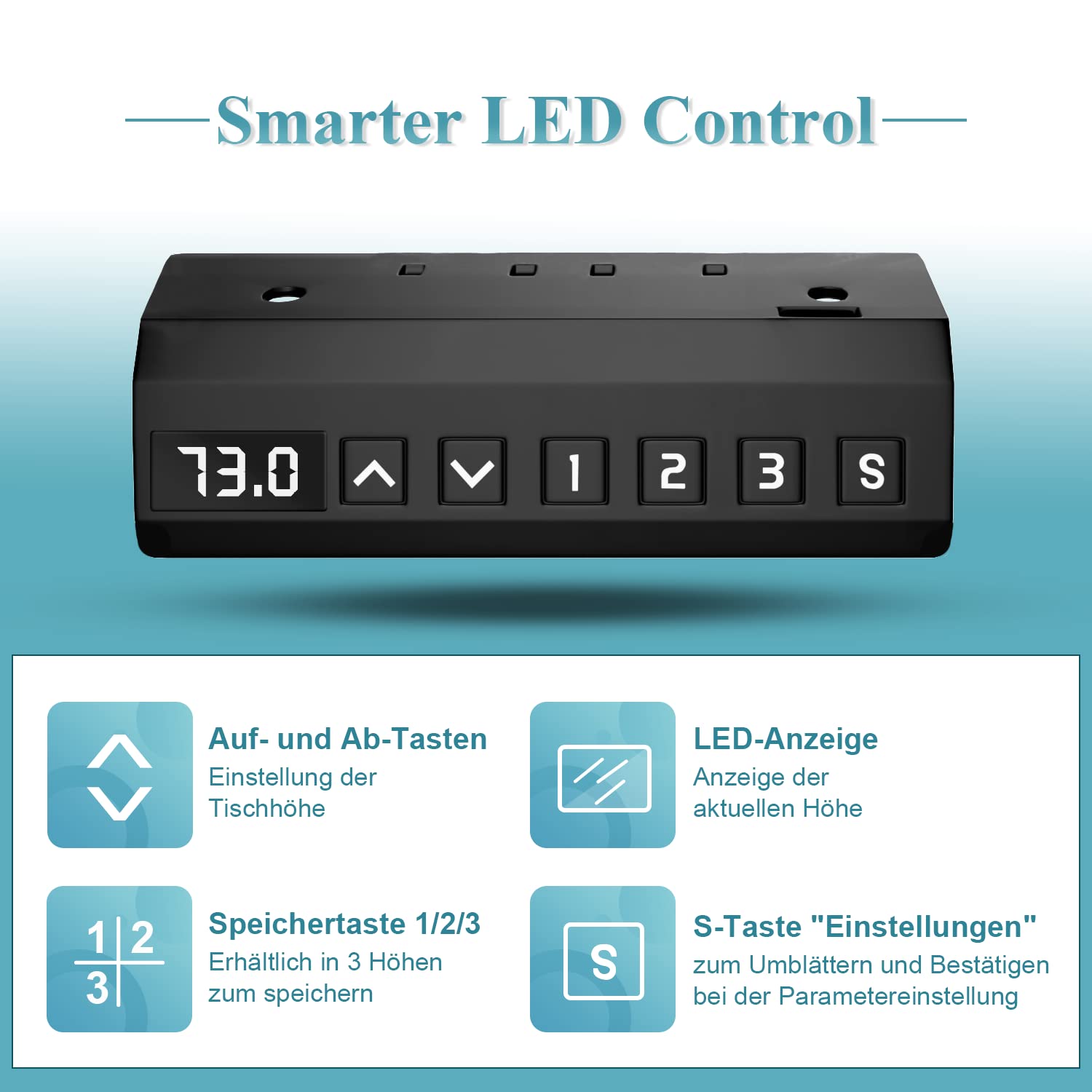 Die intuitive Steuerung verfügt über eine Memory-Funktion, mit der Sie bis zu drei individuelle Höhen speichern und bequem per Knopfdruck abrufen können. Zusätzlich sorgt ein integrierter Kollisionsschutz für Sicherheit, indem er bei Kontakt mit einem Hindernis stoppt und ein Stück zurückfährt, um Schäden zu vermeiden.