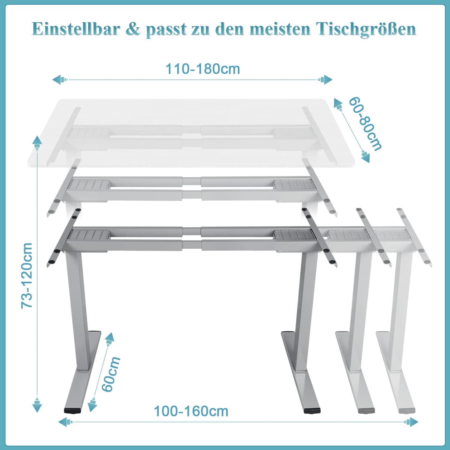 - Flexibel anpassbares Gestell: Die Breite des Gestells ist von 100 cm bis 160 cm ausziehbar und eignet sich somit für eine Vielzahl von Tischplatten (110-200 cm Länge, 60-80 cm Breite).