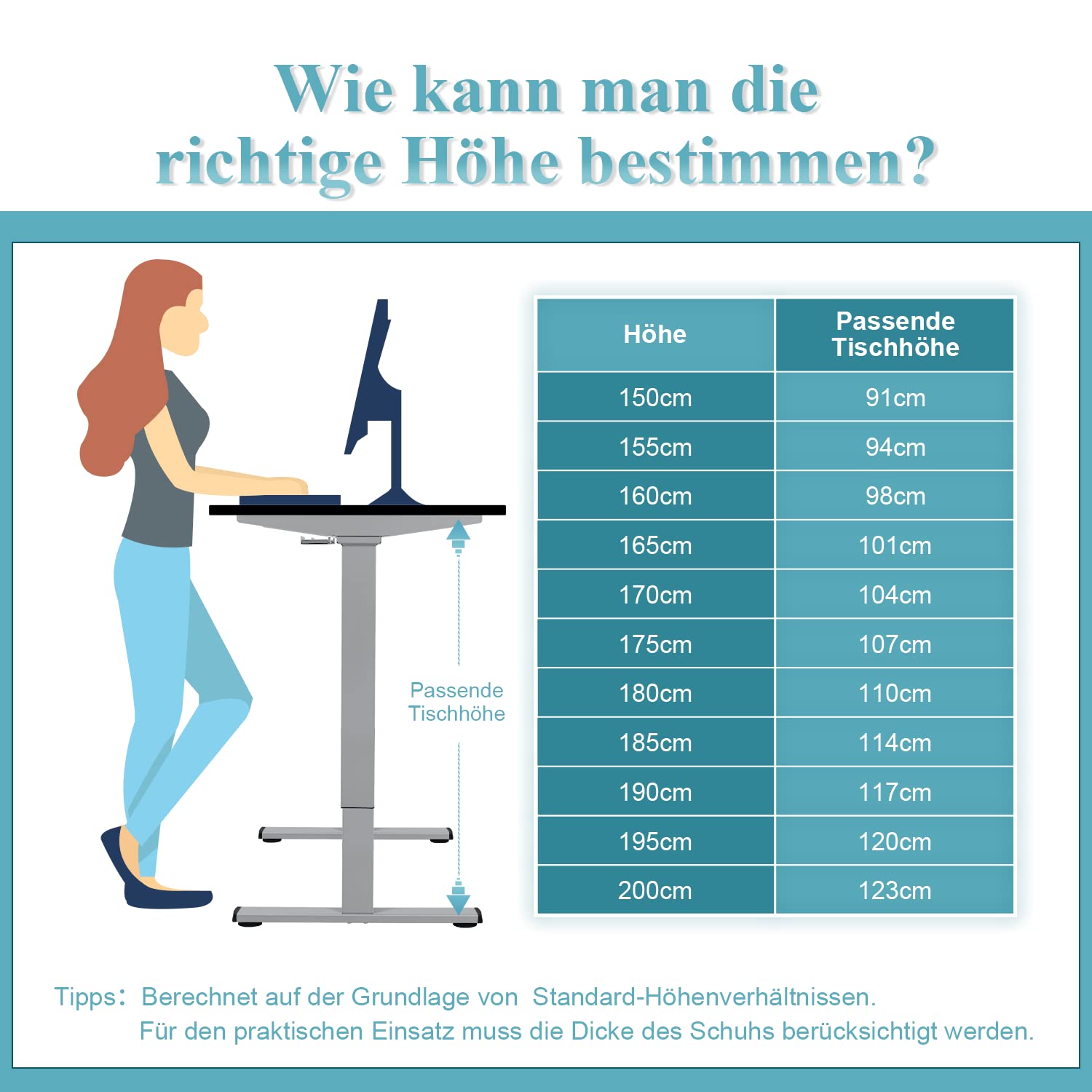 Das Tischgestell ist ideal für Personen mit einer Körpergrösse von 1,50 m bis 2,00 m. Die elektrische Höhenverstellung ermöglicht eine ergonomisch korrekte Anpassung für eine gesunde Haltung im Sitzen und Stehen, was Verspannungen vorbeugt.