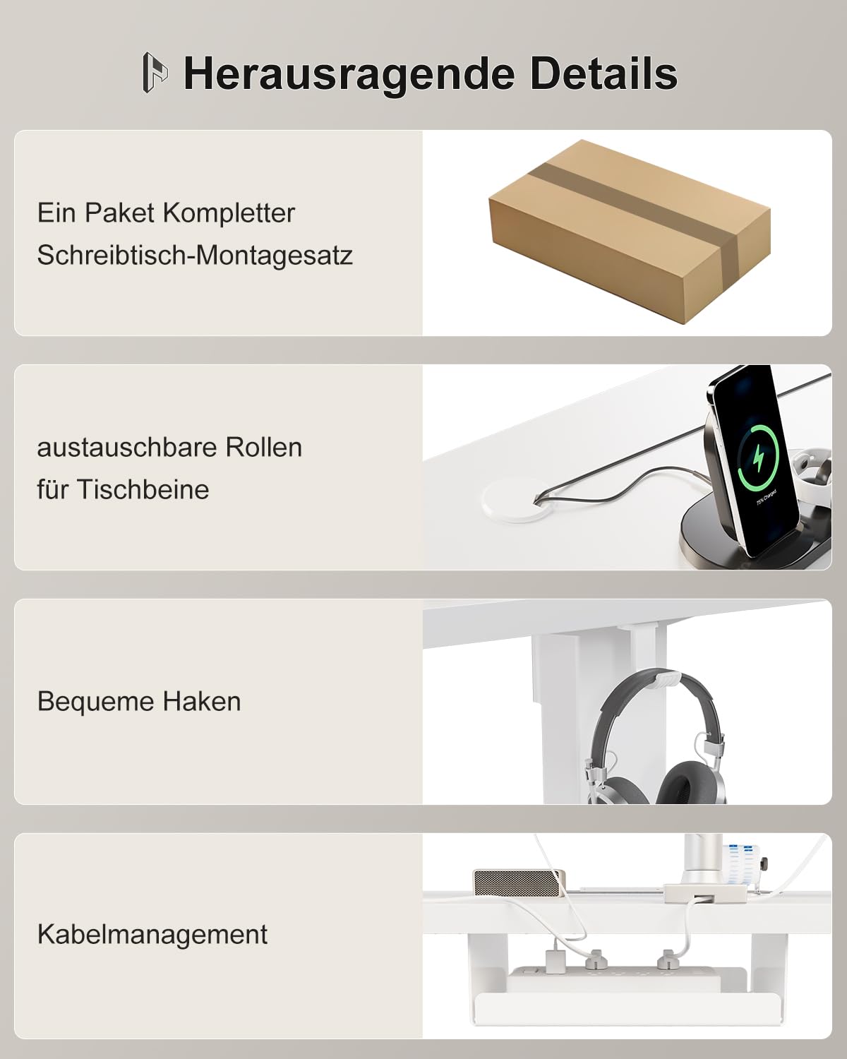 Die Tischplatte bietet reichlich Platz für eine organisierte Arbeitsumgebung. Bitte beachten Sie, dass die Platte zur einfachen Lieferung aus vier einzelnen Segmenten besteht. Der Zusammenbau gestaltet sich dank der mitgelieferten, detaillierten Anleitung und dem vollständigen Zubehör unkompliziert. Zusätzlich profitieren Sie von einem 30-tägigen, kostenlosen Rückgaberecht und einem 5-jährigen Service für Ersatzteile oder Reparaturen.