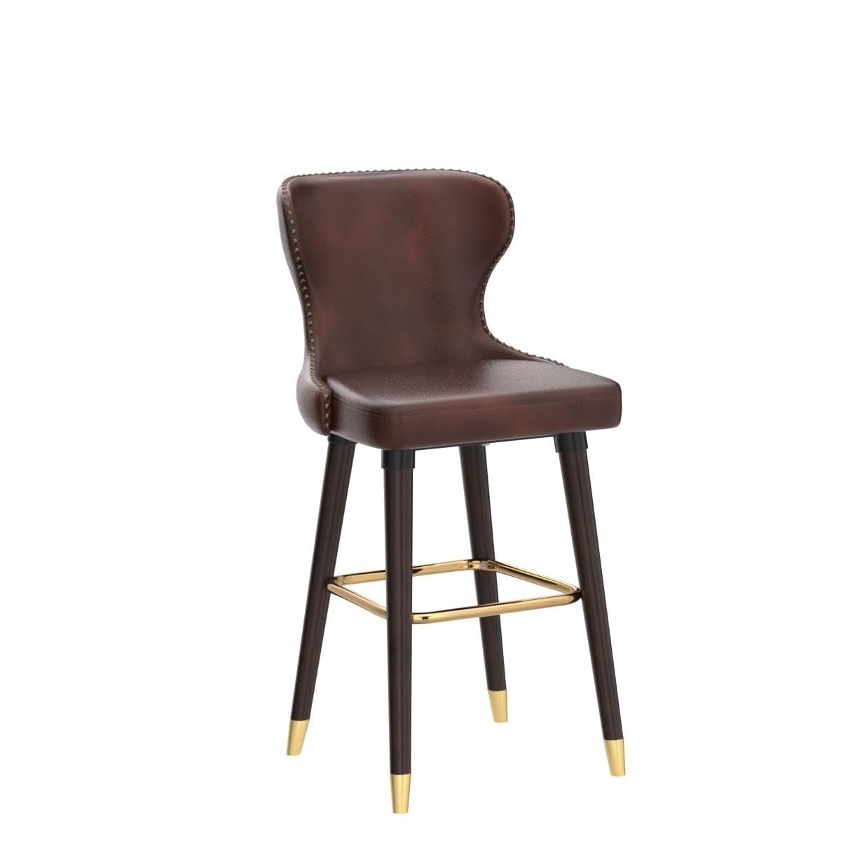 Sie erhalten zwei Barhocker im eleganten Vintage-Look. Das Design kombiniert einen pflegeleichten Kunstlederbezug mit rustikalen Nieten und goldfarbenen Akzenten an den Füssen, was für einen nostalgischen Charme an Ihrer Küchentheke oder Hausbar sorgt.