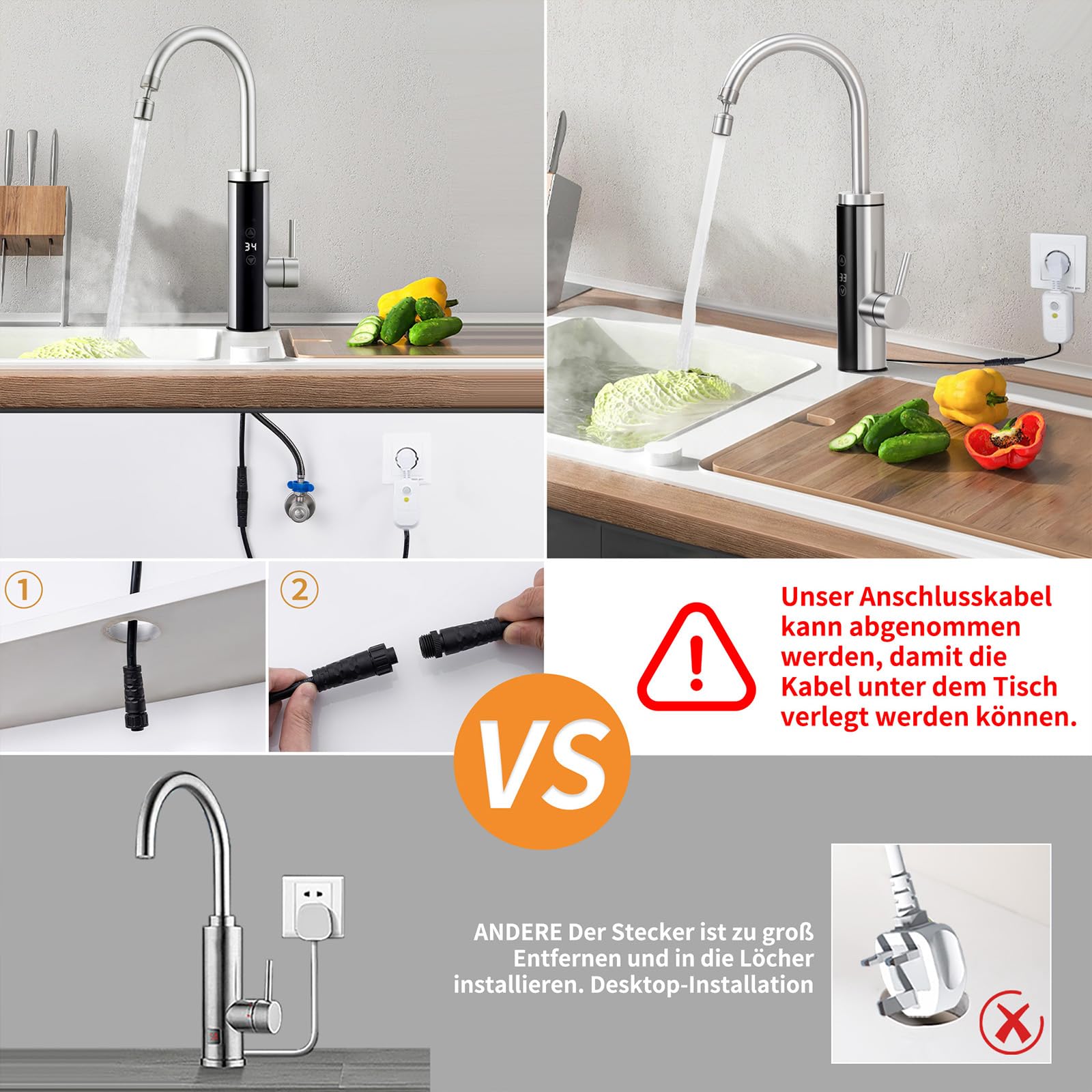 Dieser elektrische Wasserhahn revolutioniert Ihre Wasserversorgung, indem er auf Knopfdruck sofort heisses Wasser liefert – genau dort, wo Sie es brauchen, ganz ohne Boiler oder Vorheizen.