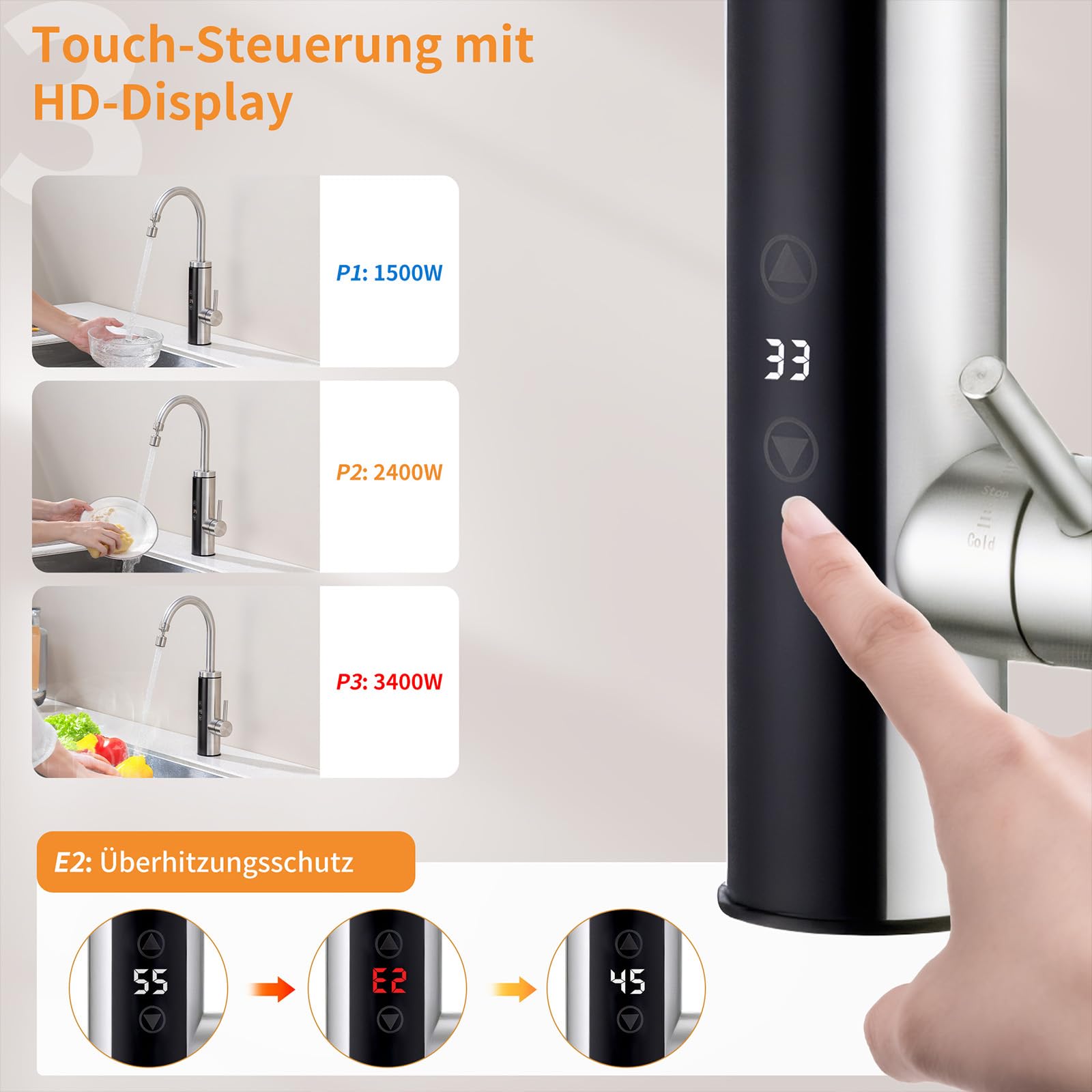 - Intuitive Touch-Bedienung: Das moderne LED-Display zeigt die Wassertemperatur in Echtzeit an. Wählen Sie per Fingertipp eine von drei Leistungsstufen (1500 W, 2400 W, 3400 W) für eine konstant präzise Temperatur.