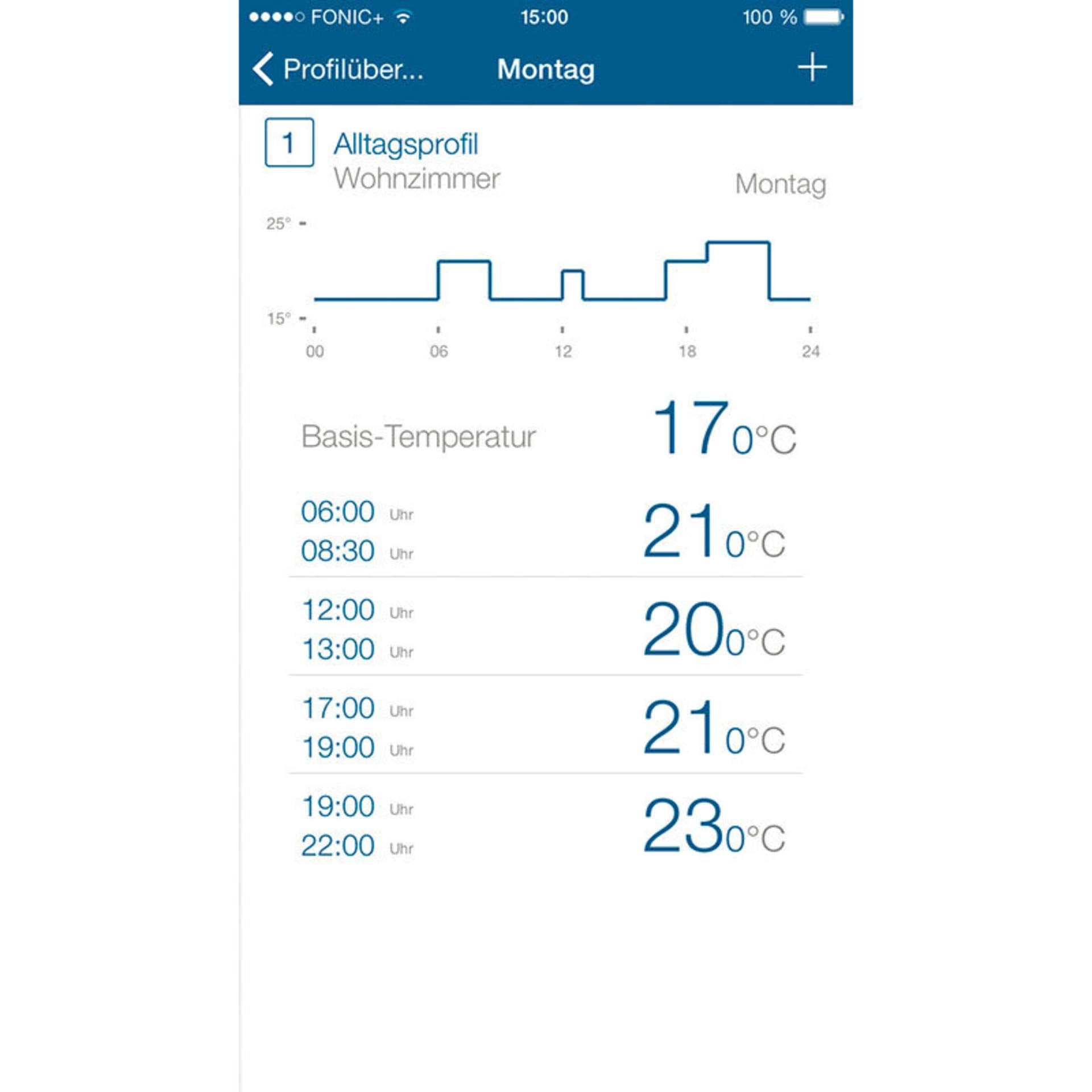 - Individuelle Heizpläne: Erstellen Sie bis zu drei persönliche Heizprofile mit bis zu 13 täglichen Anpassungen, um Ihren Tagesablauf perfekt abzubilden.