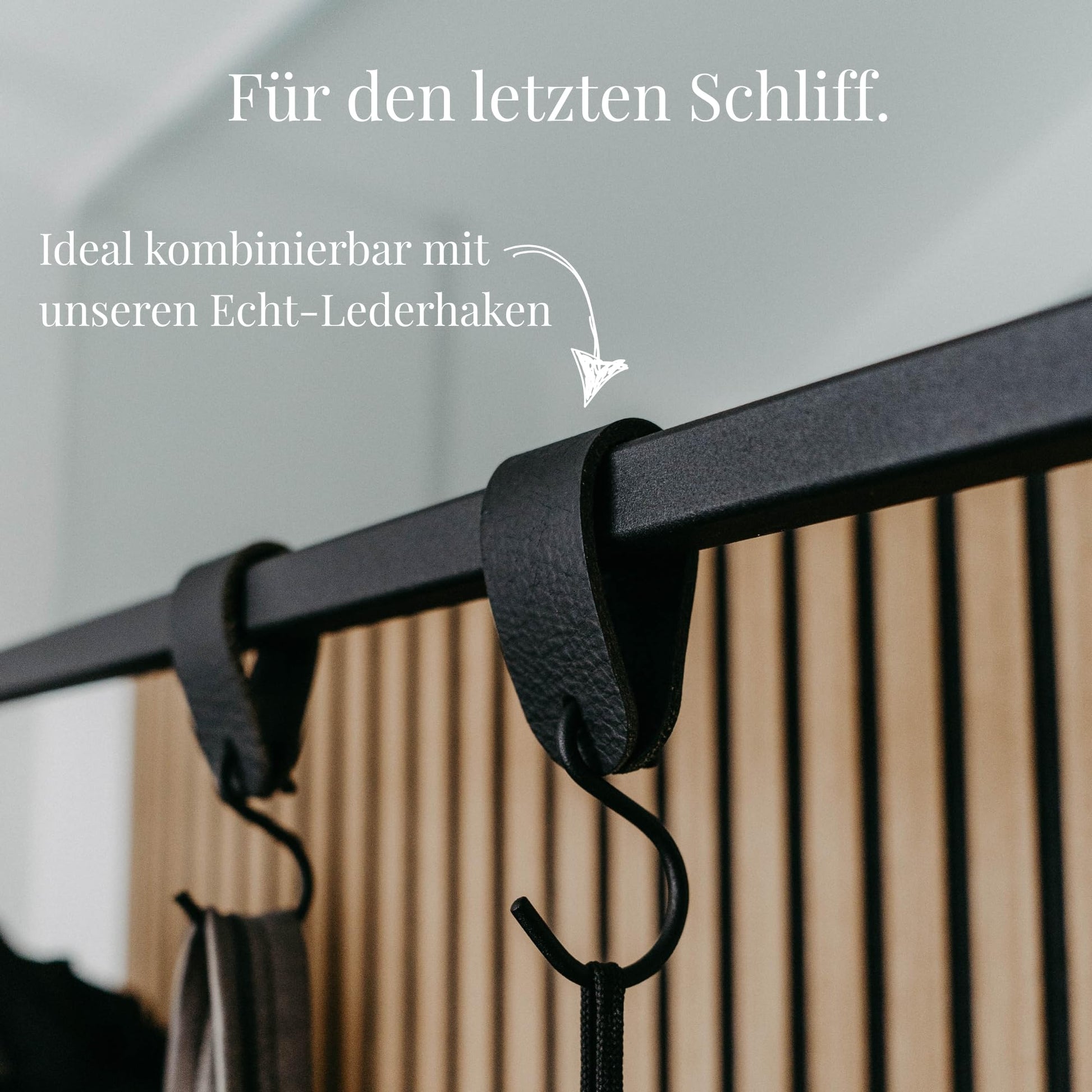 Die Garderobenstange wird aus massivem Stahl handgefertigt und mit einer hochwertigen Pulverbeschichtung veredelt. Diese Oberfläche schützt sie zuverlässig vor Kratzern sowie alltäglicher Abnutzung und garantiert eine langanhaltende, makellose Optik.