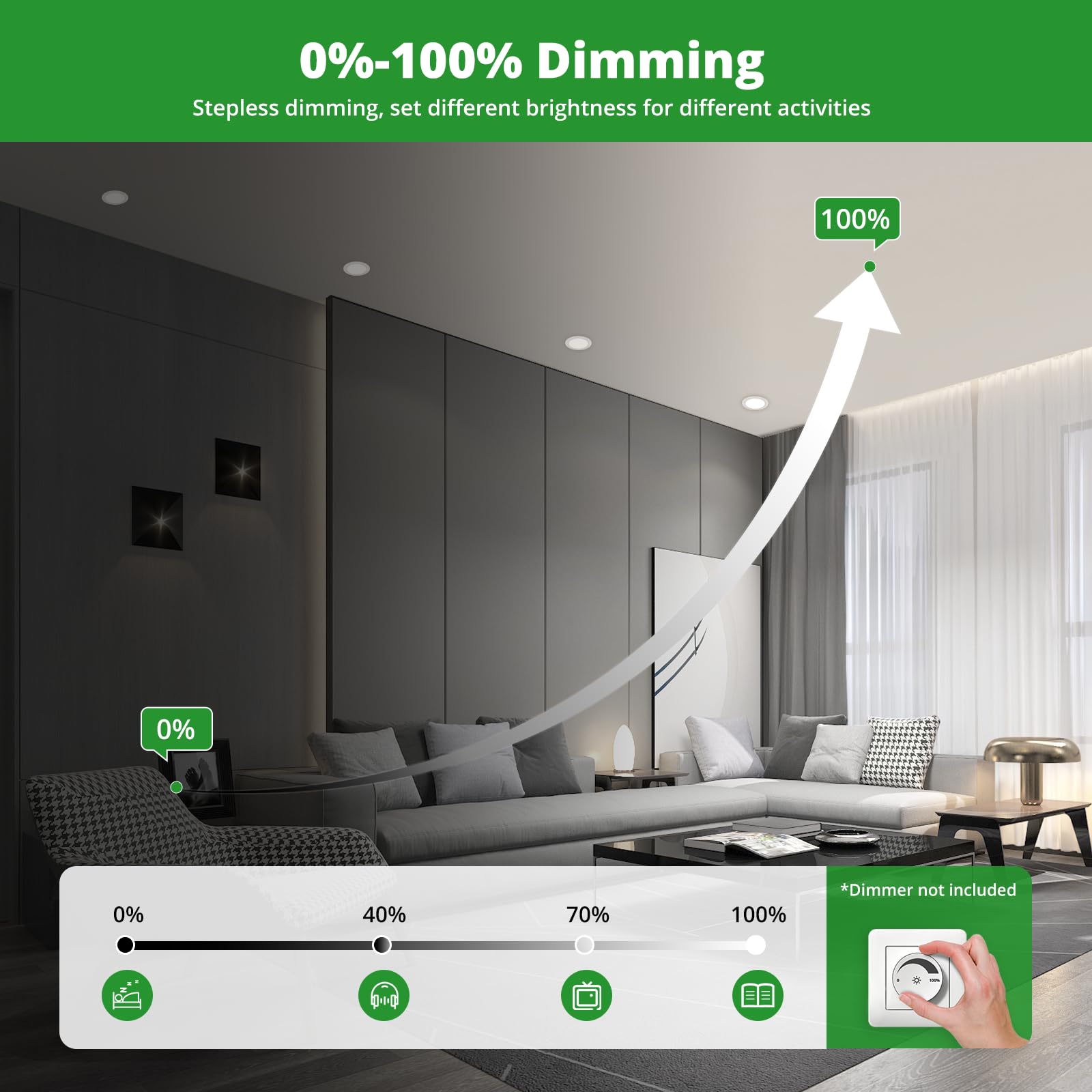 - Stufenlos dimmbar: Passen Sie die Helligkeit von 100 % bis 0 % stufenlos an Ihre Bedürfnisse an. Die Spots sind mit den meisten gängigen LED-Dimmern kompatibel (Dimmer nicht im Lieferumfang).