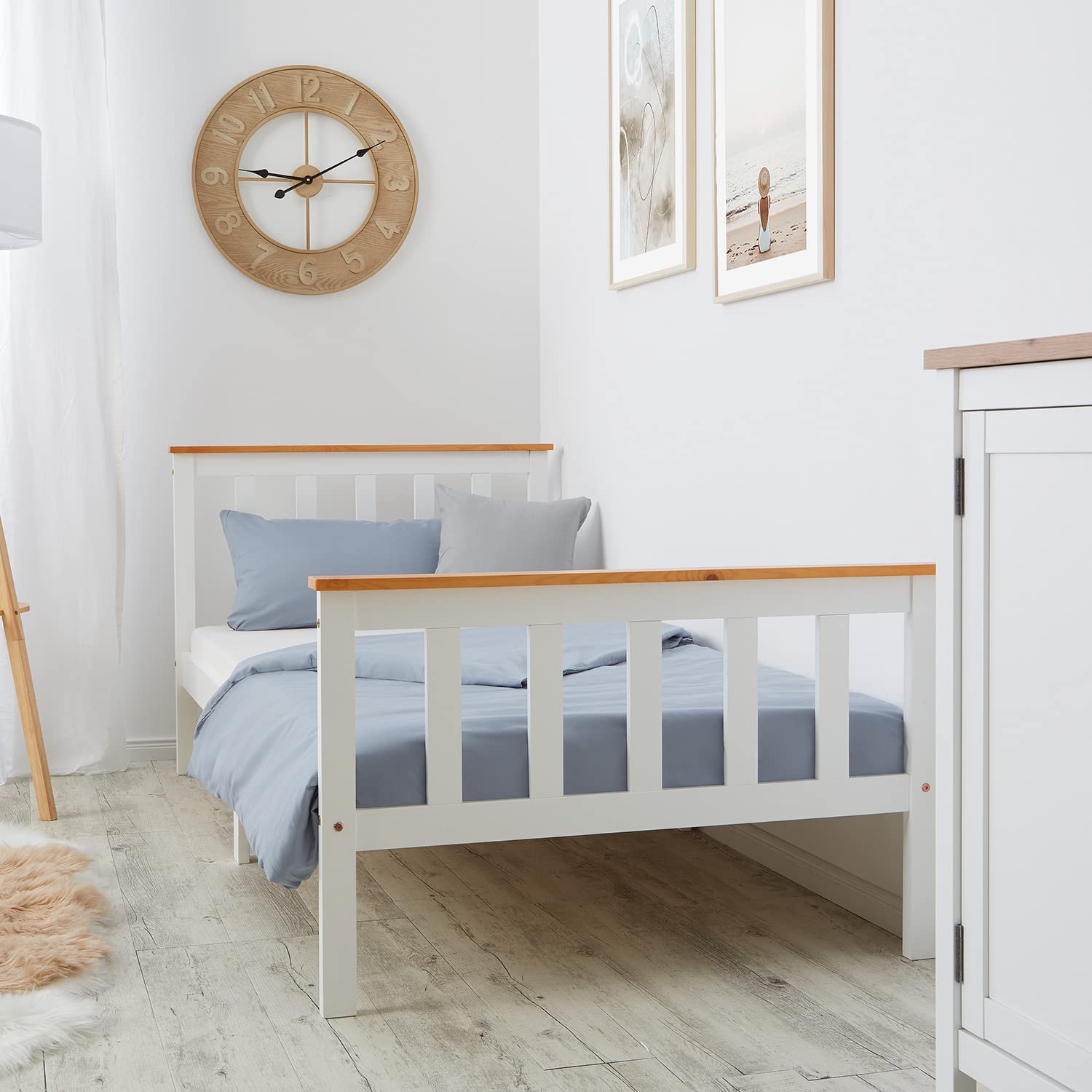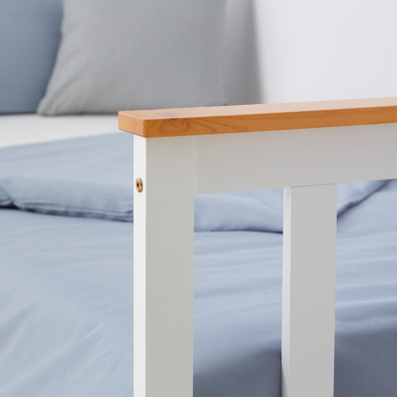 Das Bettgestell ist aus massiver Kiefer gefertigt und weiss lackiert. Die robuste Konstruktion mit massiven Bettfüssen und die Verwendung von Echtholz garantieren eine hohe Stabilität und Langlebigkeit für den täglichen Gebrauch.