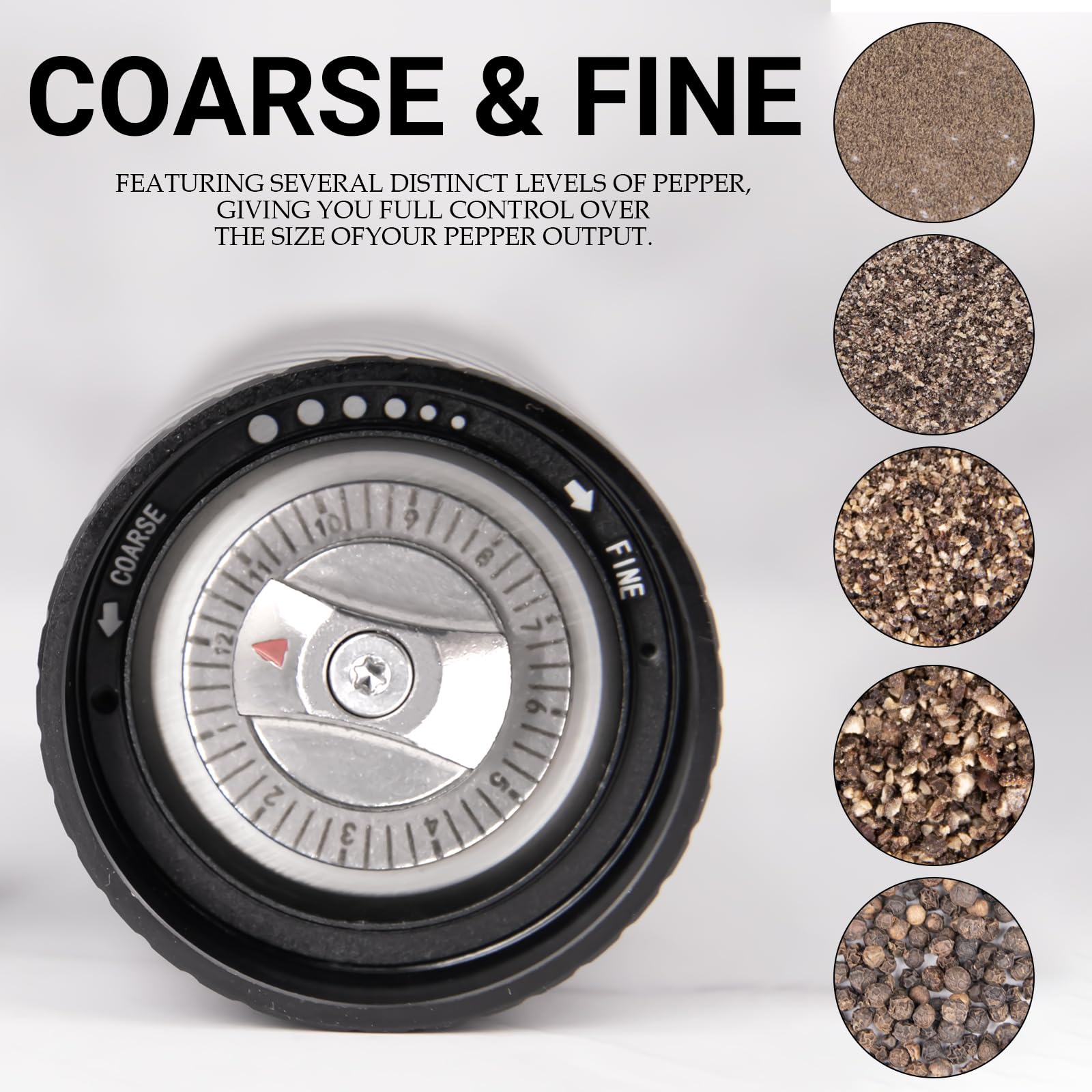 - Präzisions-Mahlwerk: Das Mahlwerk aus rostfreiem Stahl mit einer Härte von 55-58 HRC schneidet Pfefferkörner schnell und besonders gleichmässig.