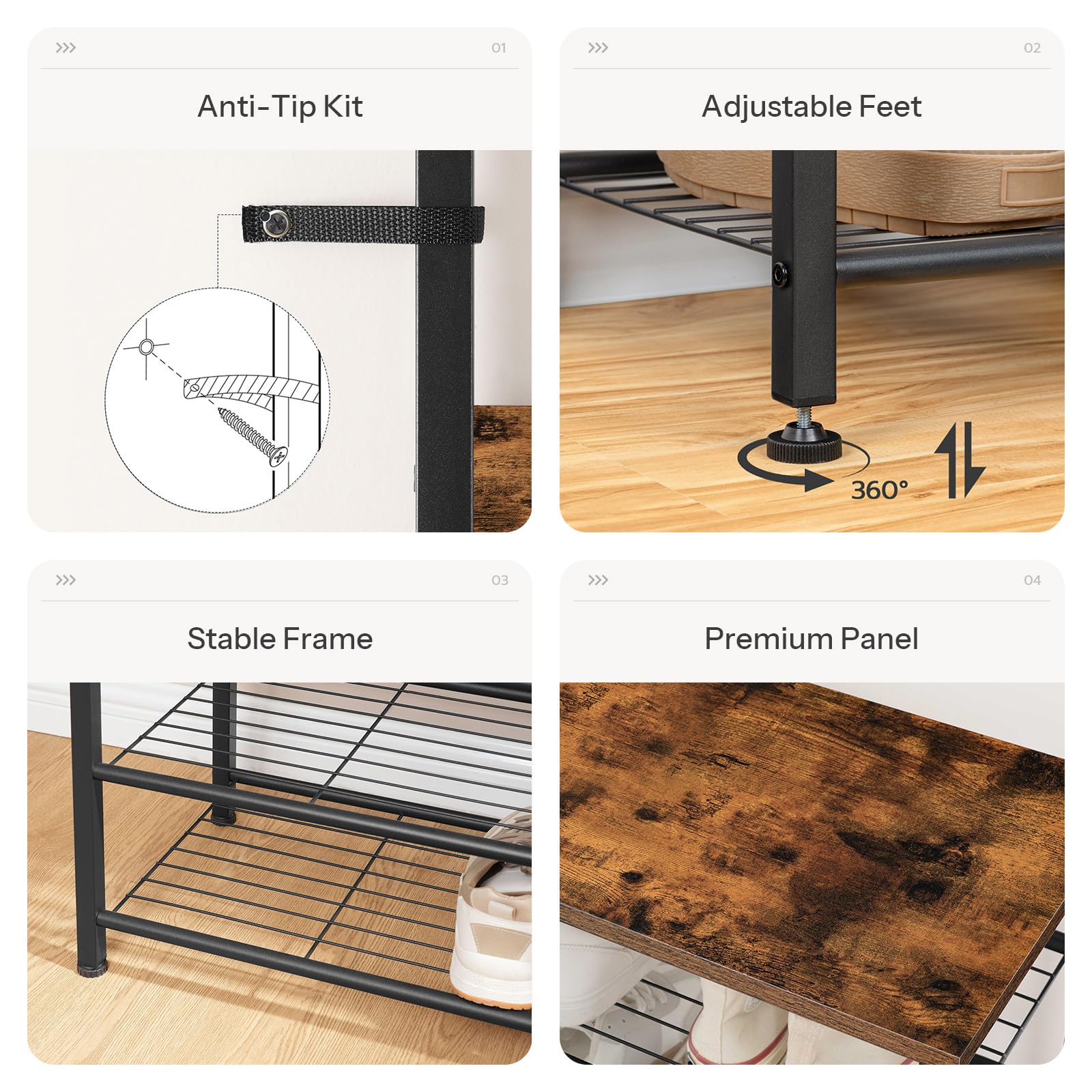 - Durchdachte Details: Vier verstellbare Gitterablagen bieten flexiblen Platz für diverse Schuhtypen. Justierbare Füsse garantieren einen sicheren Stand auch auf unebenen Böden.