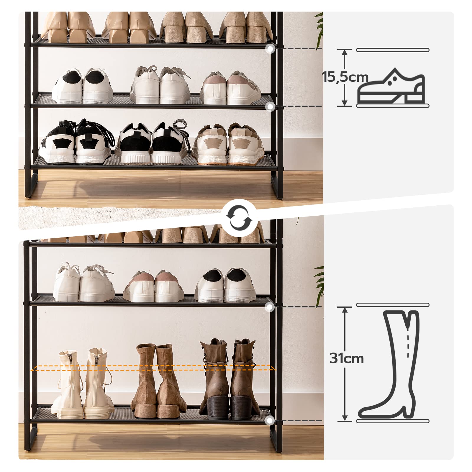 - Flexible Ablagen: Die einzelnen Gitterebenen sind herausnehmbar, sodass Sie mühelos hohe Stiefel, Arbeitsschuhe oder Finken nebeneinander unterbringen können.