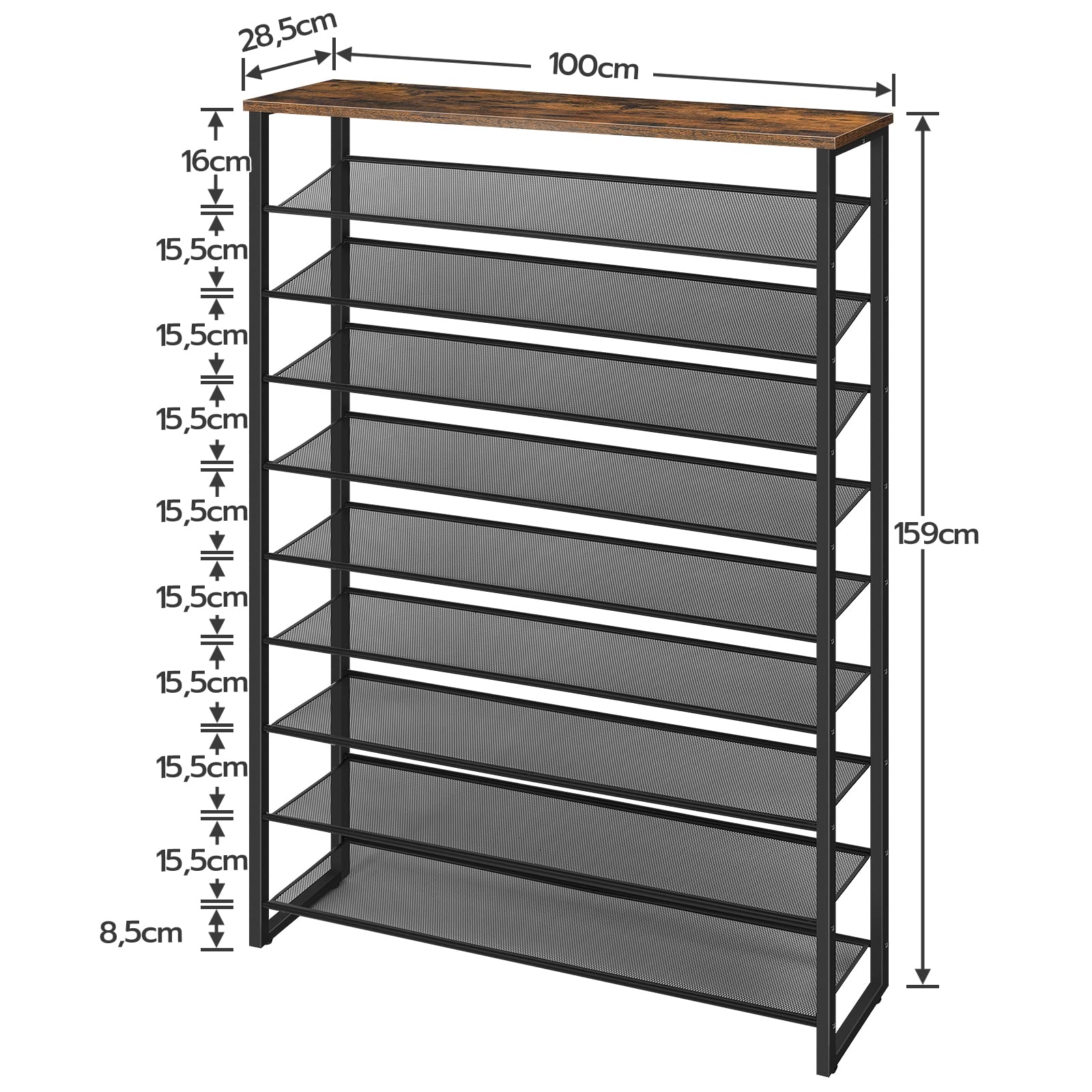 - Grosszügige Kapazität: Mit den Massen 100 x 28,5 x 159 cm bietet dieses Regal auf 10 Ebenen ausreichend Platz für circa 40 bis 50 Paar Schuhe.