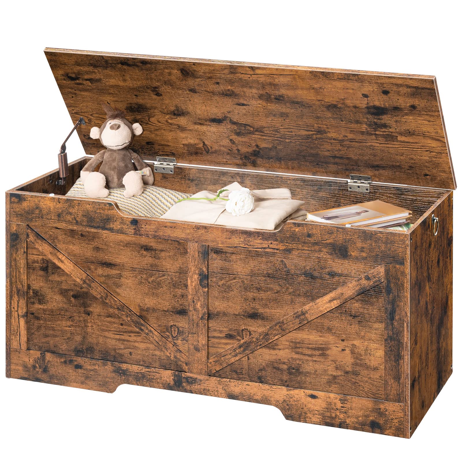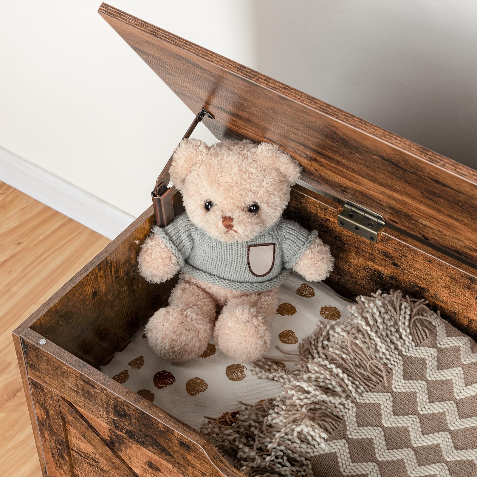 Besonders für Familien ist die Sicherheit ein entscheidender Vorteil. Der Deckel schliesst dank des Sicherheitsscharniers sanft und langsam, was das Risiko von eingeklemmten Fingern minimiert. So können auch Kinder die Truhe selbstständig und sicher nutzen, um ihre Spielsachen aufzuräumen und dabei spielerisch Ordnung zu lernen.