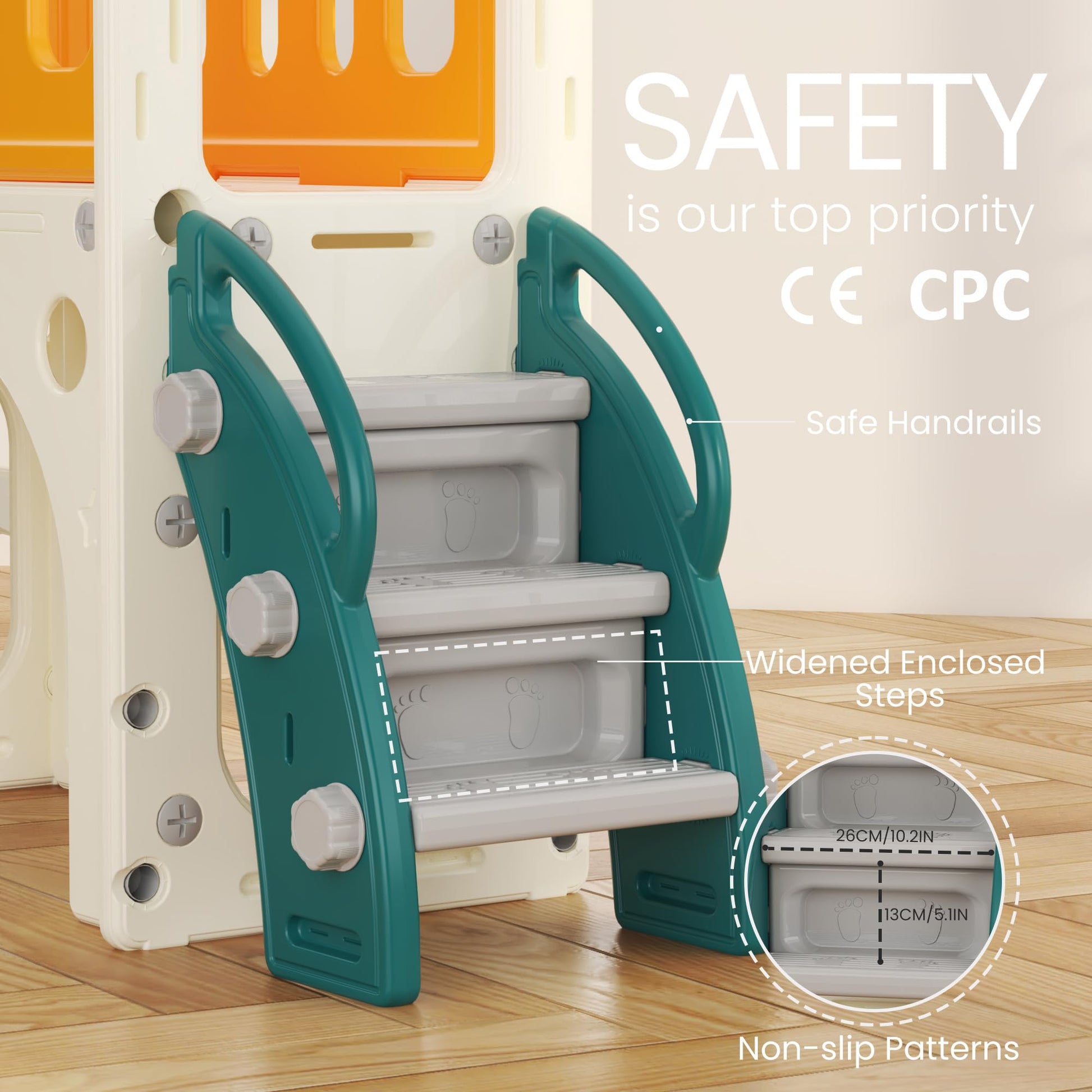 Die Sicherheit hat oberste Priorität. Das Set besteht aus geprüftem, robustem und wasserfestem HDPE-Kunststoff, der die strengen EU- und US-Sicherheitsnormen erfüllt. Alle Oberflächen sind sorgfältig geglättet und frei von scharfen Kanten. Zudem sorgt die Rutsche mit ihrer verlängerten Pufferzone und den erhöhten Seitenwänden für sanfte und sichere Landungen.