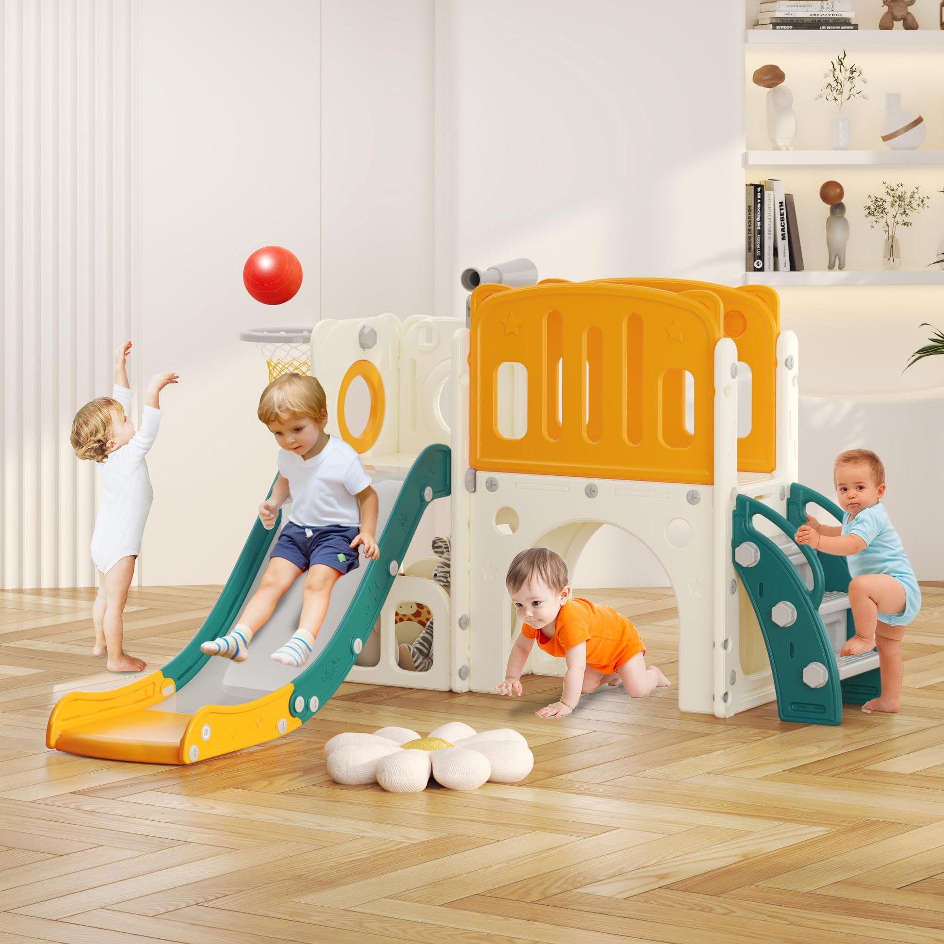 Dieses multifunktionale Spielcenter vereint fünf spannende Aktivitäten in einem Gerät, um Ihr Kind zu beschäftigen: ein Klettergerüst zum Kraxeln, eine lange Rutsche für rasanten Spass, einen Basketballkorb zum Üben der Treffsicherheit, ein Teleskop für kleine Entdecker und einen lustigen Krabbeltunnel.