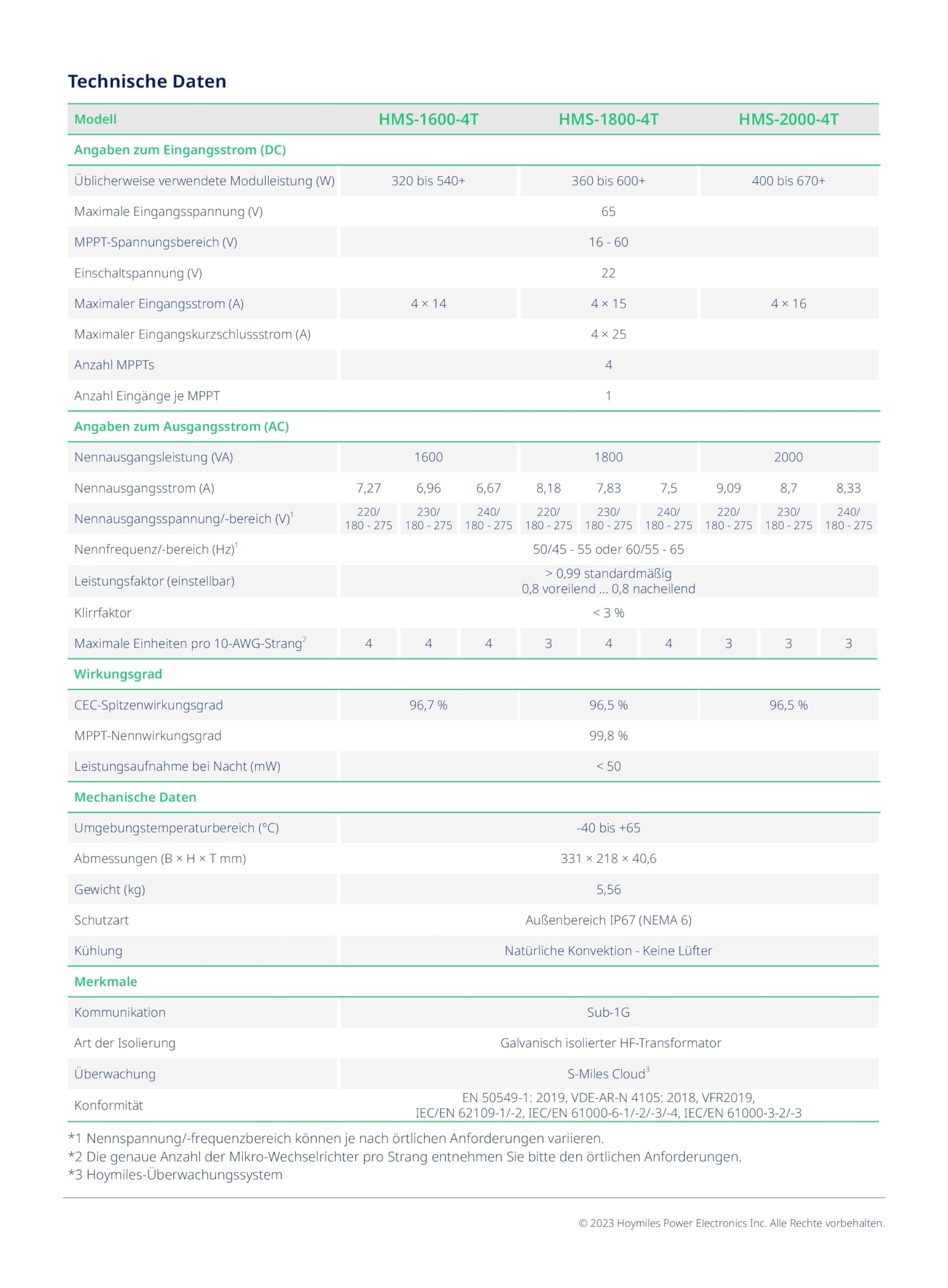 Der HMS-2000-4T ist für den Anschluss von bis zu vier Solarmodulen konzipiert. Er ist sehr flexibel und kompatibel mit gängigen Modulen, die eine Leistung von jeweils 400W bis über 670W haben, was eine hohe Gesamtleistung der Anlage ermöglicht.