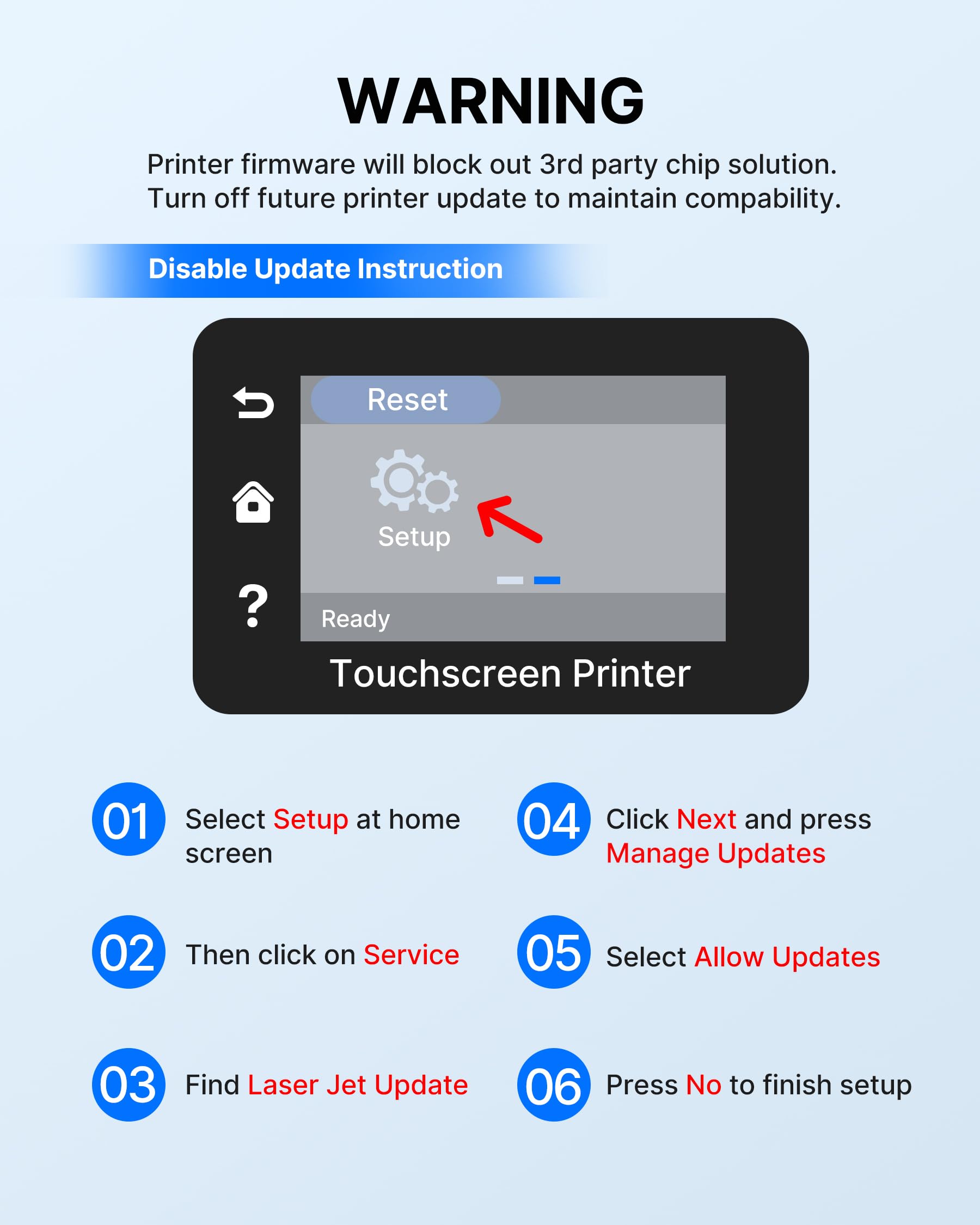 Um eine reibungslose und dauerhafte Funktion der Tonerkartuschen sicherzustellen, empfehlen wir Ihnen, die automatische Firmware-Aktualisierung Ihres Druckers zu deaktivieren. Eine eventuelle Aktualisierung der Drucker-Software durch den Hersteller kann die Kompatibilität von alternativen Kartuschen beeinträchtigen. Dieser Schritt hat keinen Einfluss auf die normale Nutzung Ihres Druckers.