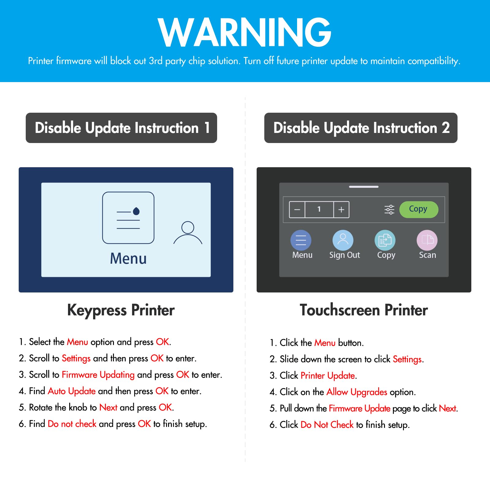 Unsere Kartuschen sind mit den neuesten Chips für maximale Kompatibilität ausgestattet. Da Druckerhersteller Updates zur Blockierung von Fremdtonern nutzen können, wird empfohlen, die automatischen Firmware-Updates an Ihrem Drucker zu deaktivieren, um eine durchgehend reibungslose Funktion zu gewährleisten.