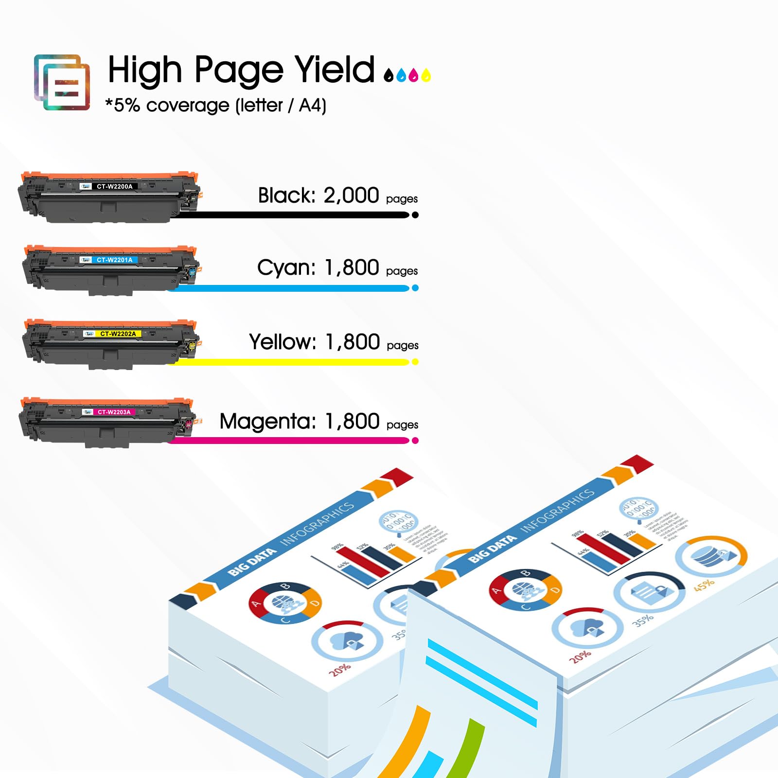 - Hohe Seitenleistung: Drucken Sie bis zu 2000 Seiten in Schwarz und jeweils bis zu 1800 Seiten in den Farben Cyan, Gelb und Magenta (basierend auf 5% Deckung pro A4-Seite).